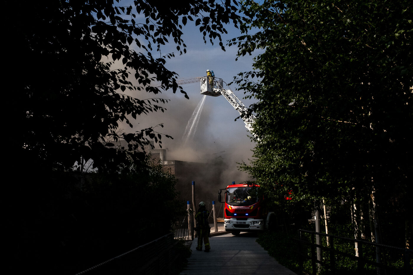 En fin d’après-midi, l’alerte incendie résonne sur les haut-parleurs de la caserne. Une voix grave préenregistrée annonce froidement « Alerte. Départ incendie. ». Les bruits des bottes résonnent immédiatement dans le bâtiment. Quelques petites minutes suffisent pour qu’ils atteignent l’incendie, situé à un kilomètre de la caserne, sur la Chaussée d’Anvers. Depuis la nacelle, à 30 mètres de haut, ils découvrent un hangar en briques, envahi de fumées noires ; on y distingue nettement le rouge vermillon du brasier. Les lances à eau entrent en action, soutenues par une seconde équipe munie d’une autopompe venue du parc voisin. Les fumées s’éclaircissent, le feu est maîtrisé mais perdure, tout comme le mystère au sujet de la cause de l’incendie. Personne ne semble capable de dire clairement ce que contient ce hangar.