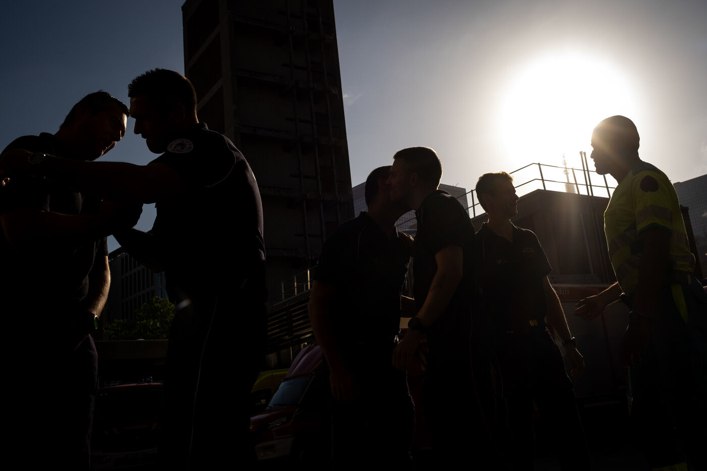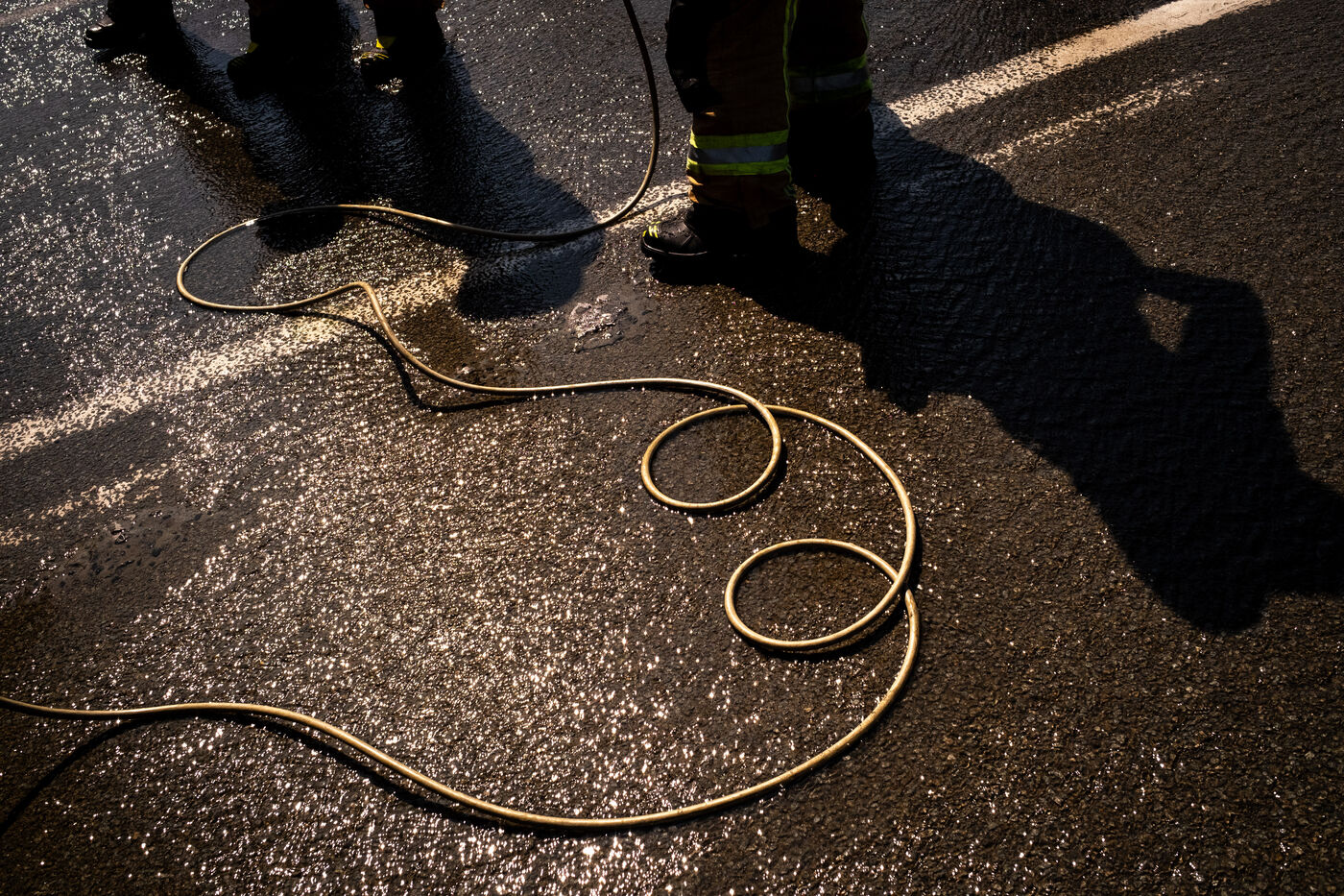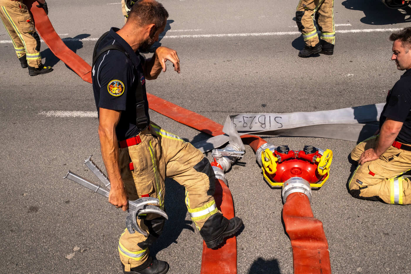 The heatwave and the heaviness of the gear make the fire’s heat emissions barely bearable. After an hour of effort, the firefighters’ scarlet faces emerge from the smoke. They shed their equipment, exhausted, while paramedics hand them bottles of water. “The supply truck is here!” a colleague shouts, pointing to a red camper van loaded with drinks and waffles.