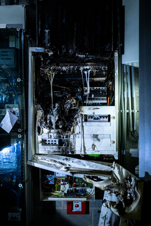 Once the parking garage has been cleared of smoke, the officer goes down with the electrician to inspect the condition of the electrical panel, which did indeed burn. On site, they discover heaps of melted plastic—originally white—that have turned the deepest black. Only just installed, the panel is completely charred, a testament to the violence of the fire. After the smoke has been cleared and the inspection completed, firefighters and electrician together assess the damage.