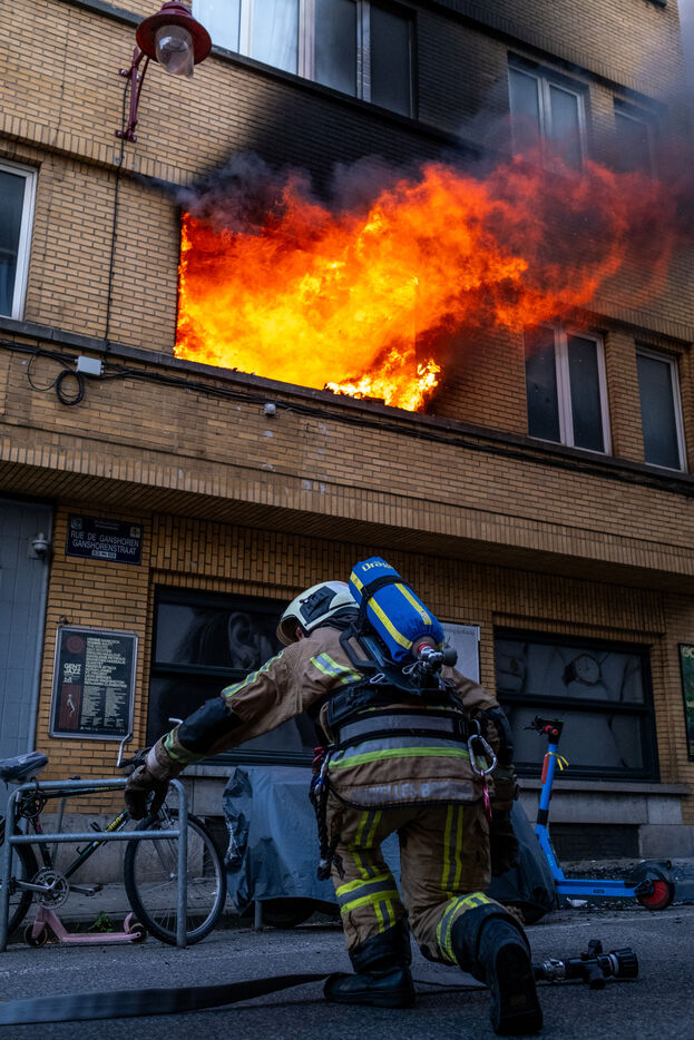 L’incendie est spectaculaire. Des flammes denses jaillissent avec violence de la baie vitrée du premier étage et la combustion est si vive qu’elle résonne d’un bruit sourd. « Ça clashe dehors », dit-on en vieux bruxellois pour qualifier un feu pleinement développé qui s’échappe de l’immeuble.