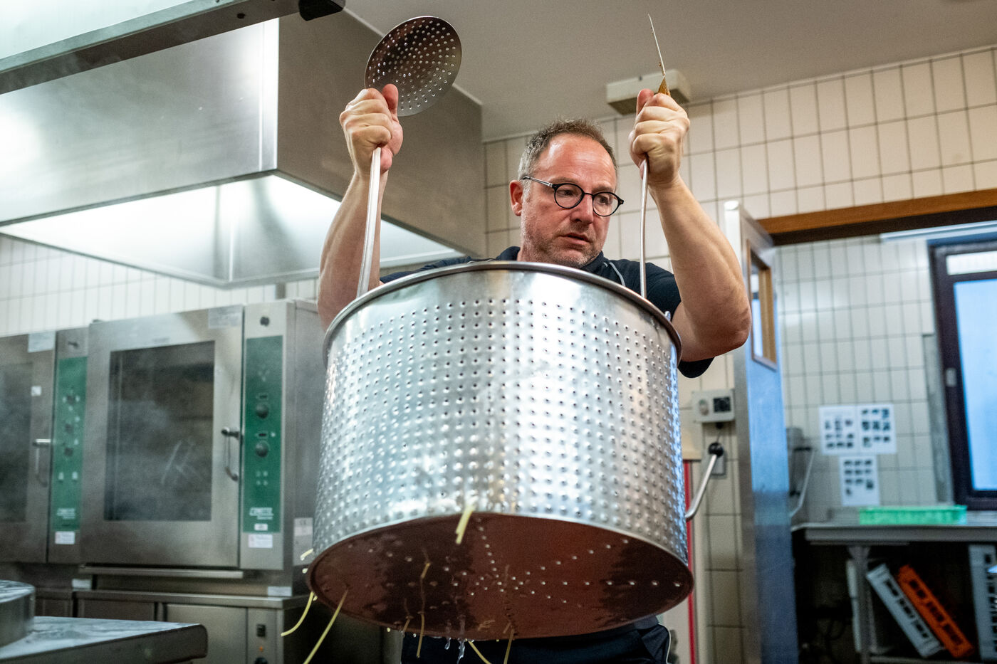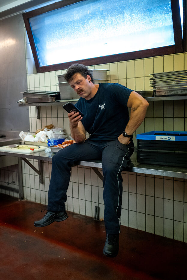 Once the equipment has been checked and the inventory completed, it is time for a coffee break and pastries in the mess hall. Guan, a sergeant with an imposing build and 21 years on the job, lays out the day’s schedule: gym workout, chores, meal, nap, drill, instruction, second round of exercise, then free time from 6 p.m. onward. Each person, however, remains responsible for specific tasks until the evening.