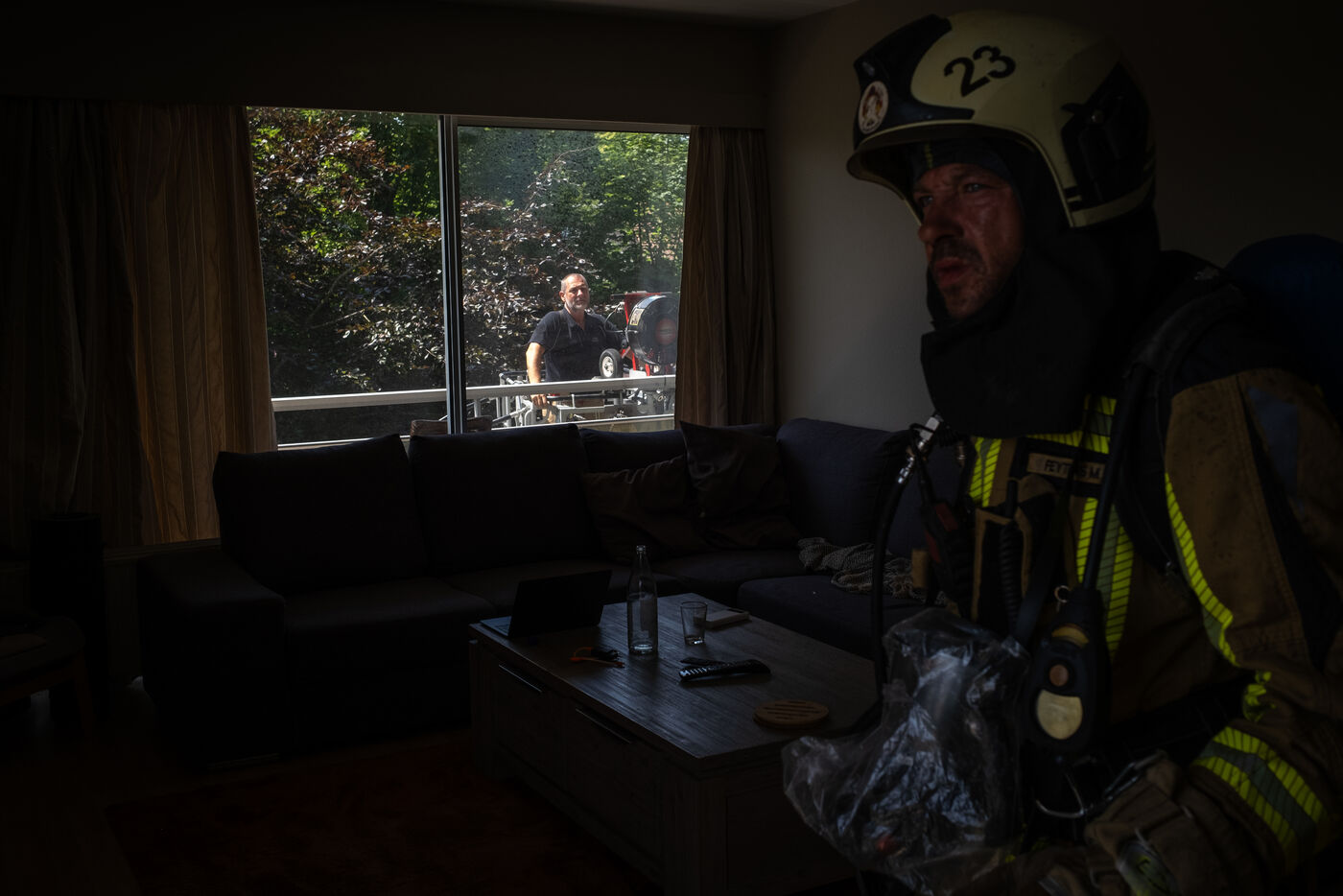 Le travail est encore long pour sécuriser le bâtiment et s’assurer que l’incendie ne redémarre pas. La chambre est aspergée et les pans de murs cramoisis sont arrachés. Chaque objet ou mobilier encore chaud est jeté par la fenêtre, s’écrasant sur le goudron pour peu à peu former un tas qui sera continuellement arrosé pendant un quart d’heure.