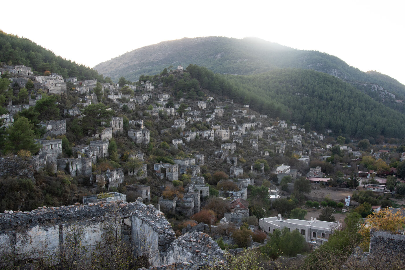 Le village "fantôme" de Kayaköy nommé Levissi en grec moderne, se situe près de Fethiye dans la province de Mugla en Turquie. Le village habité majoritairement par 10 000 grecs chrétiens orthodoxes a été abandonné dans les années 1920 lors de l'échange de populations entre la Grèce et la Turquie. Kayaköy compte 14 chapelles, 2 églises, 2 écoles et des centaines de maisons d'environ 50 m2 qui n’interfèrent pas entre elles en terme de paysage et de lumière du jour. Chaque maison avait sa citerne d'eau. Un séïsme en 1957 a également contribué à la destruction des maisons.