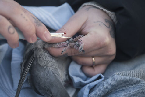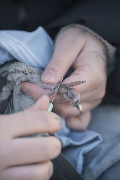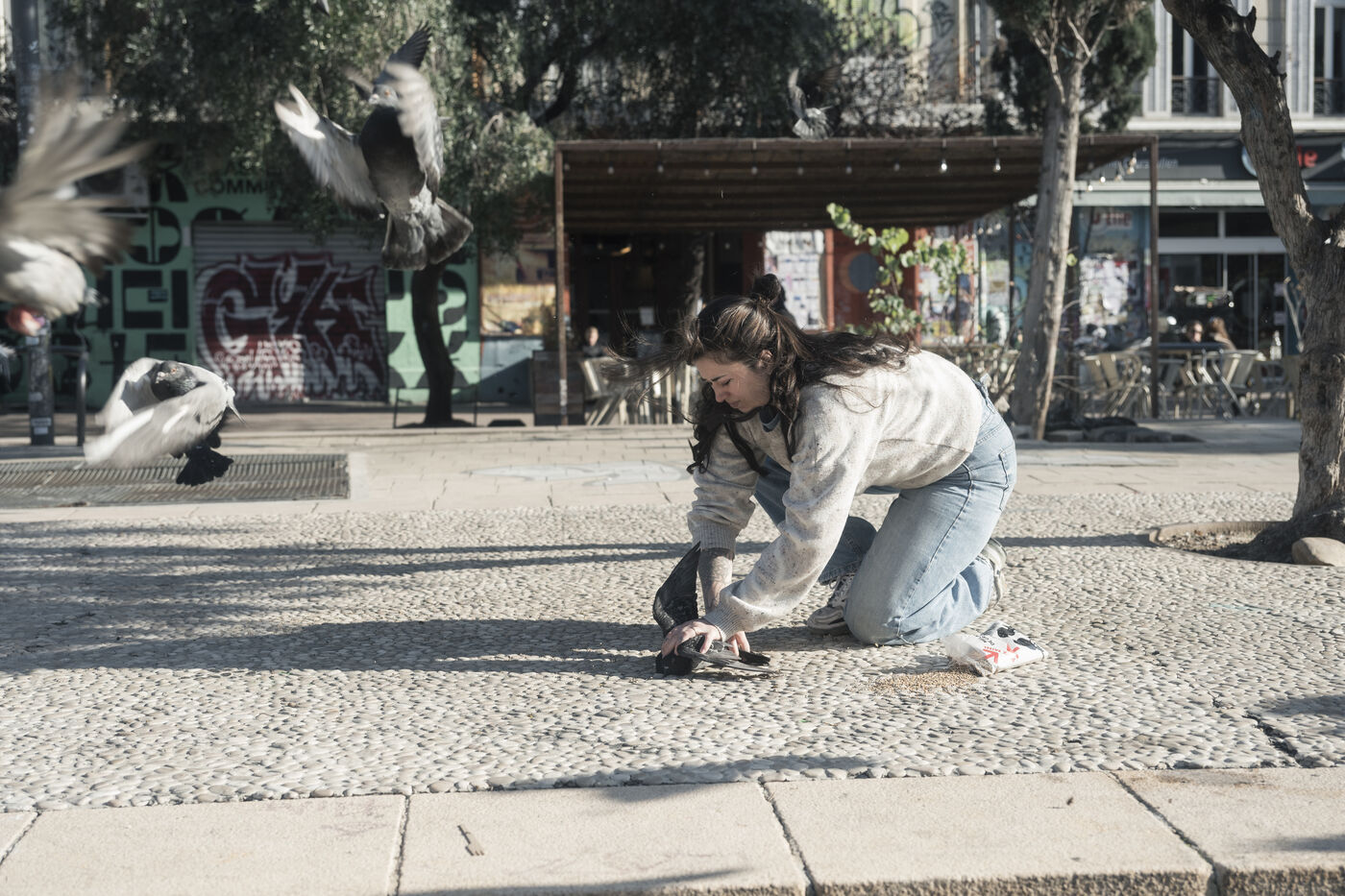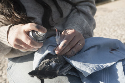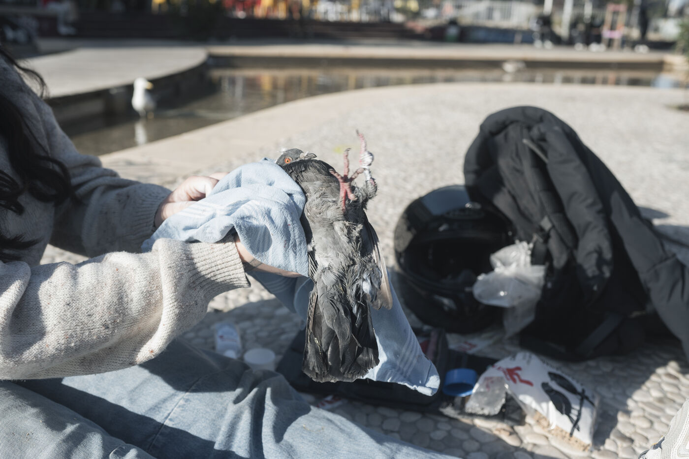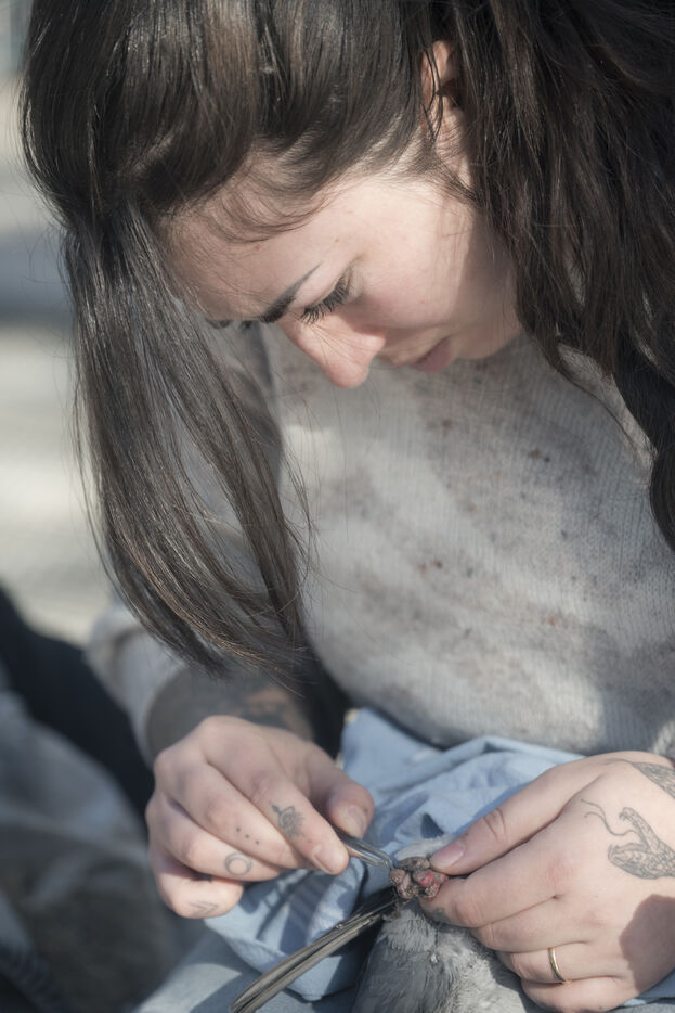 In the streets of Marseille, Céline regularly catches pigeons to free their legs and then releases them immediately. Her care kit consists simply of a towel to put over the pigeon's head, a pair of scissors, a de-feathering tool, tweezers, alcohol-free disinfectant, a kind of colloidal agent and hydroalcoholic gel.