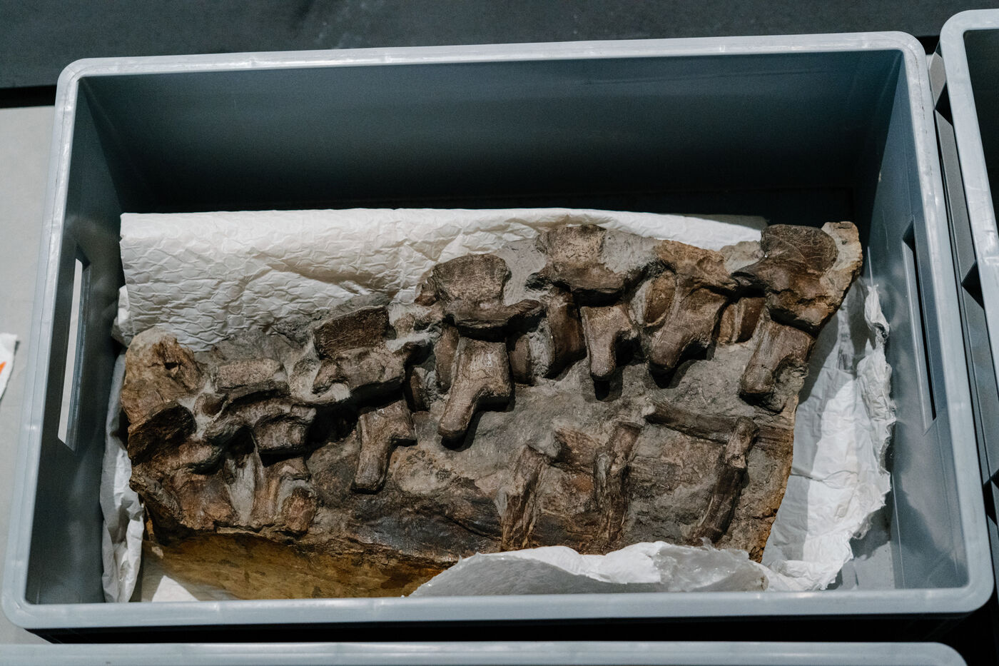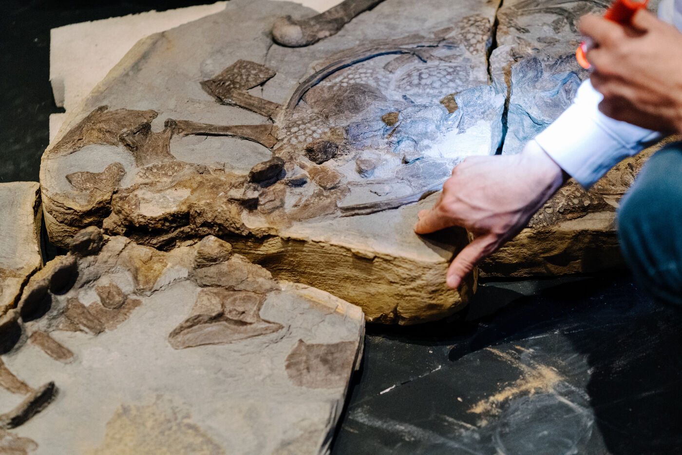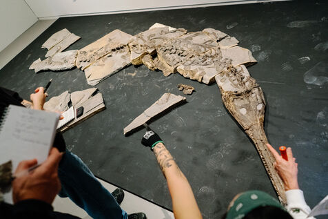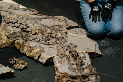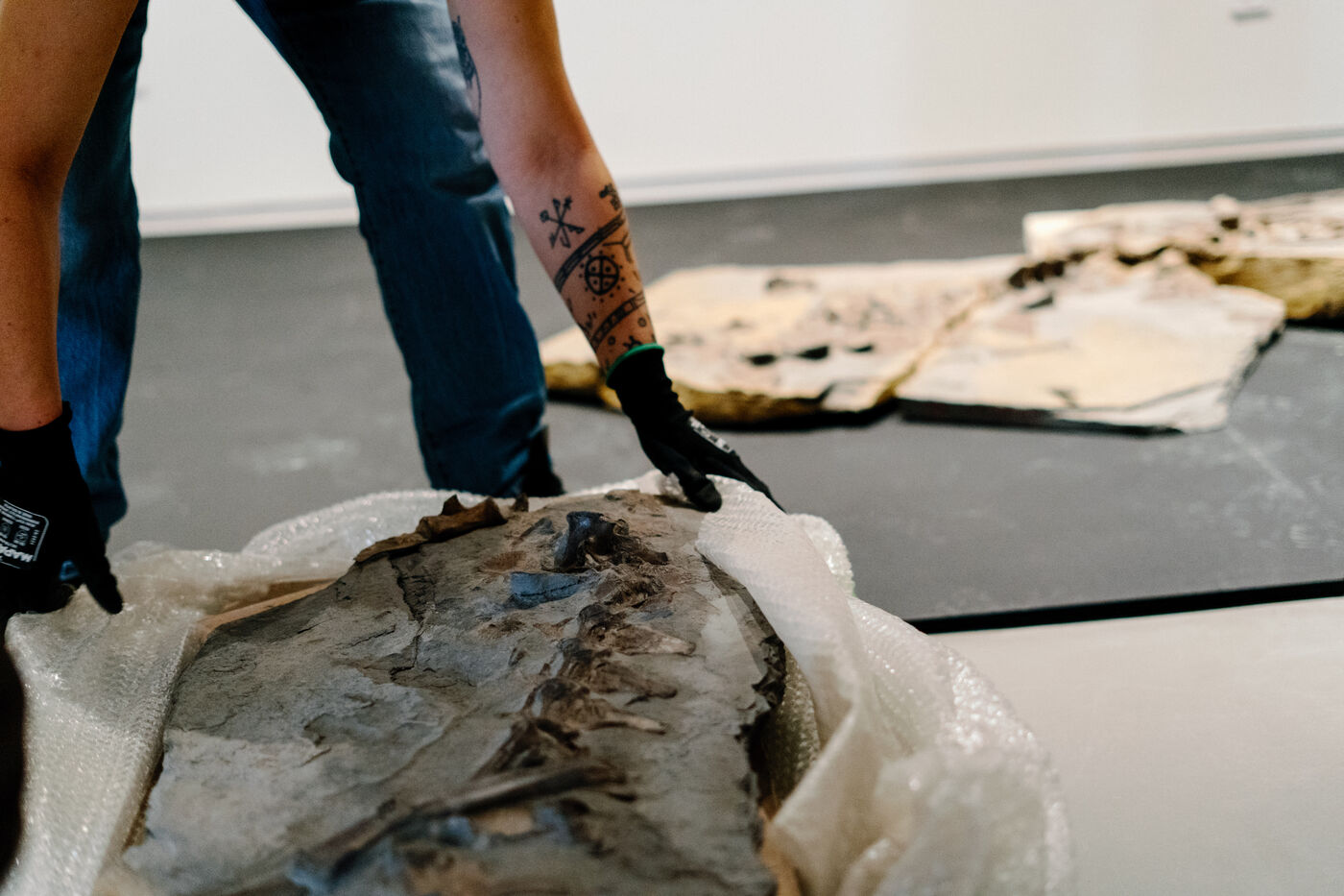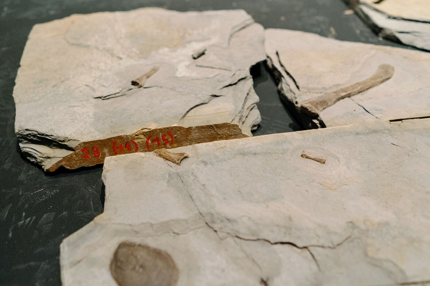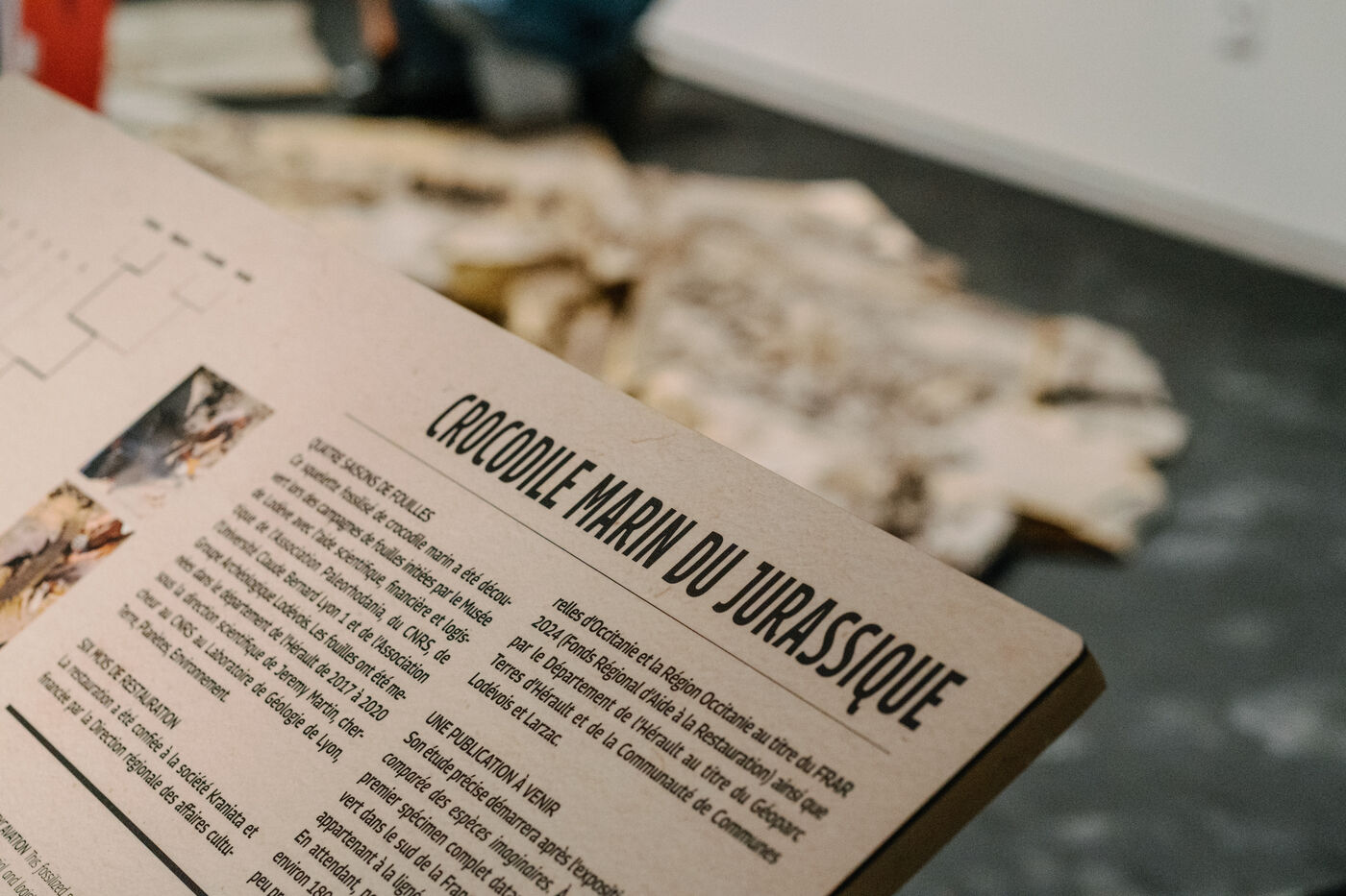 Un fossile de crocodile datant du jurassique est assemblé devant la presse au Musée de Lodève. Ce fossile de crocodile marin a été mis à jour lors de fouilles organisées de 2017 à 2020. 6 mois de restauration par la société Kraniata ont été nécessaires pour mettre au jours les détails des ossements. Long de près de 5 mètres, ce spécimen exceptionnel est exposé du 18 octobre 2025 au 15 mars 2026.