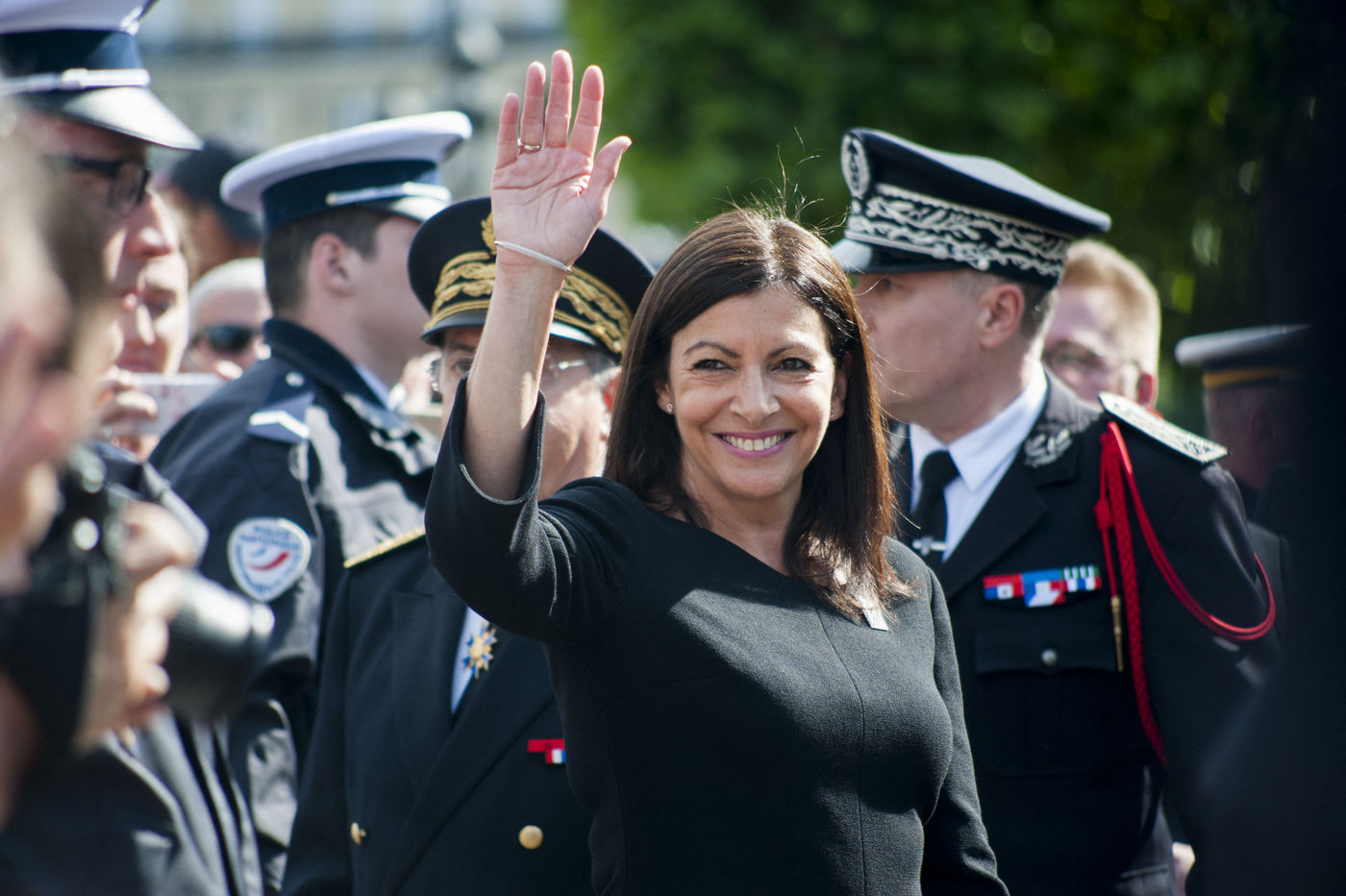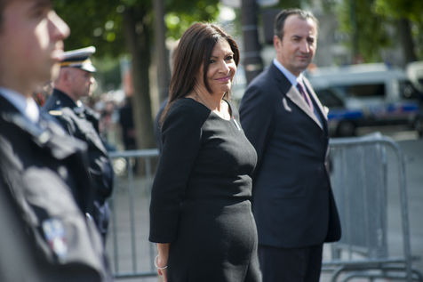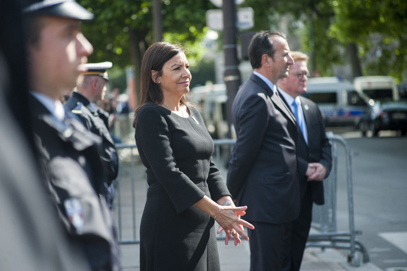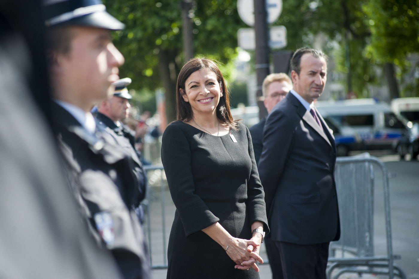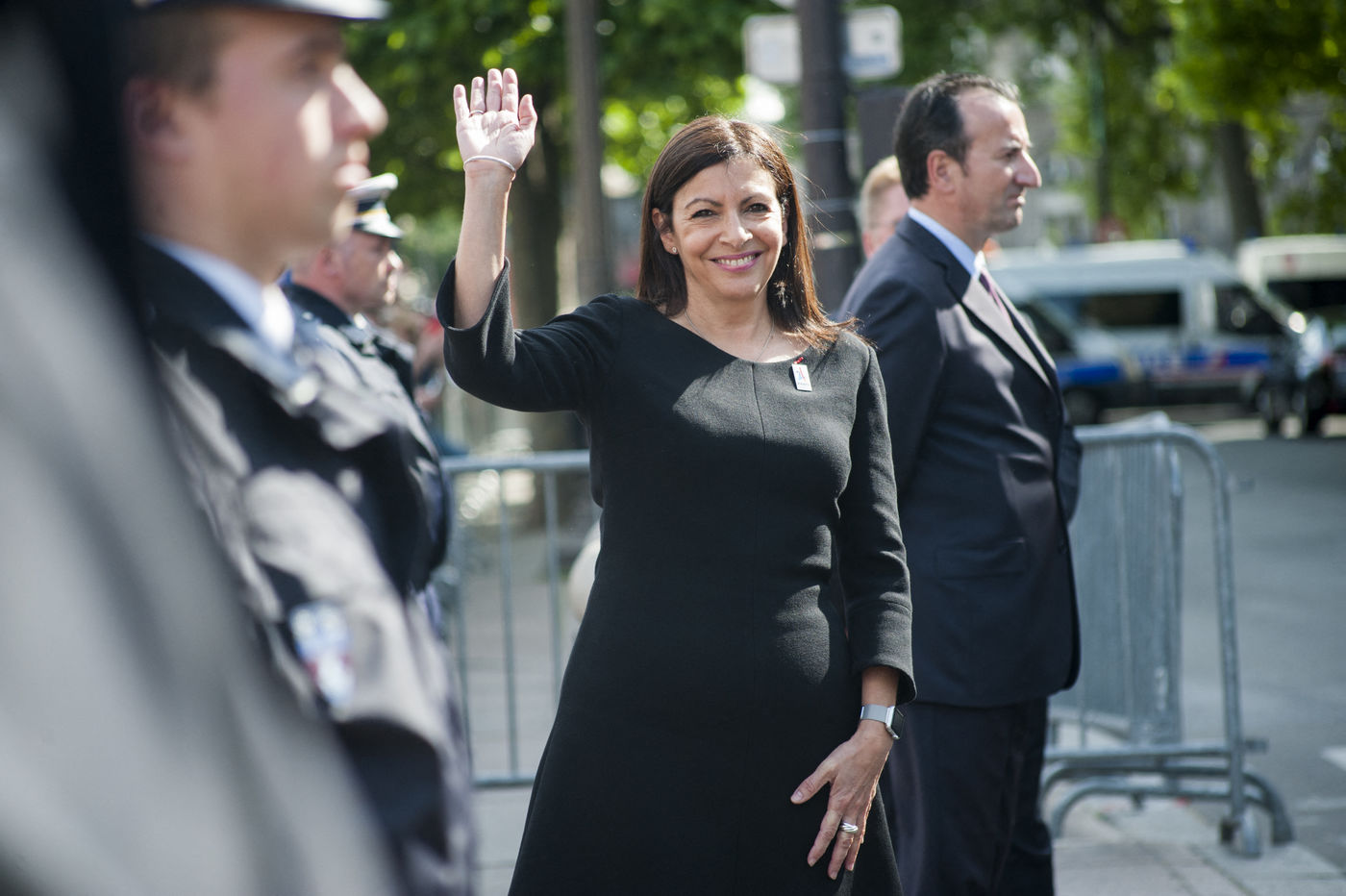 14 mai 2017, Paris, Visite du Président de la République Macron à la Maire de Paris, jour de son investiture. Il est accueilli par Anne Hildago, Bruno Julliard, et accompagné de sa femme Brigitte Macron.