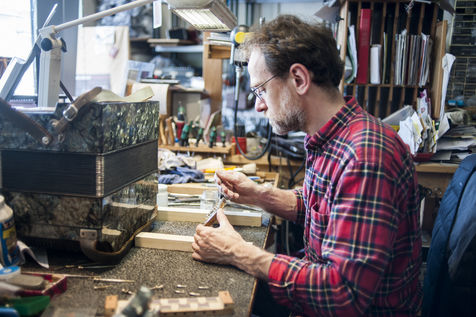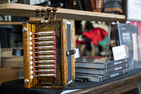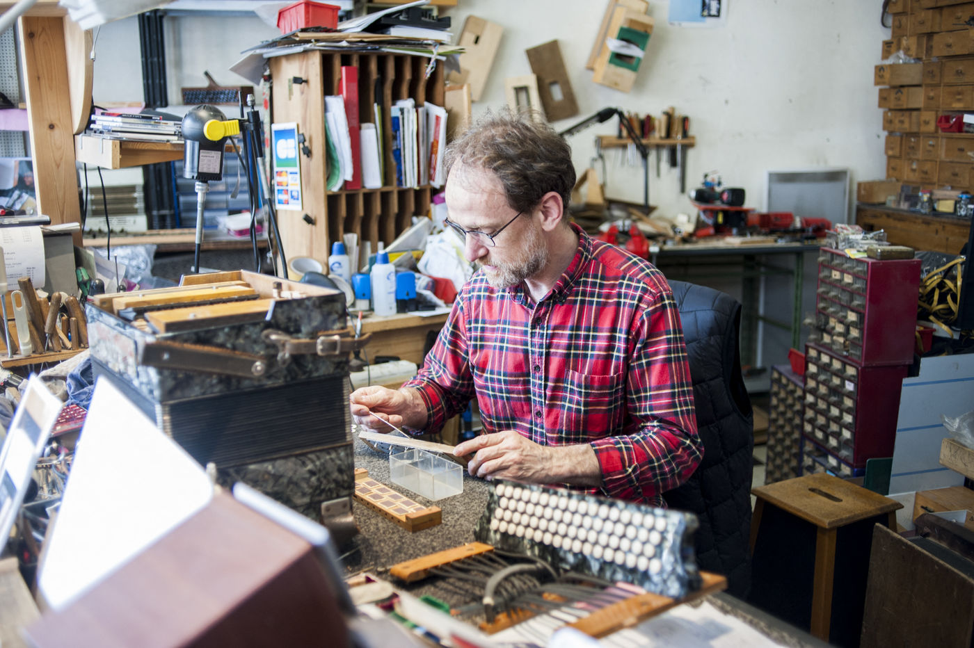 Juin 2016, dans la boutique de Laurent Jarry, maître artisan, facteur, réparateur d'accordéon à Montreuil dans sa boutique atelier nommée "la boîte d'accordéon". Vente et réparations.