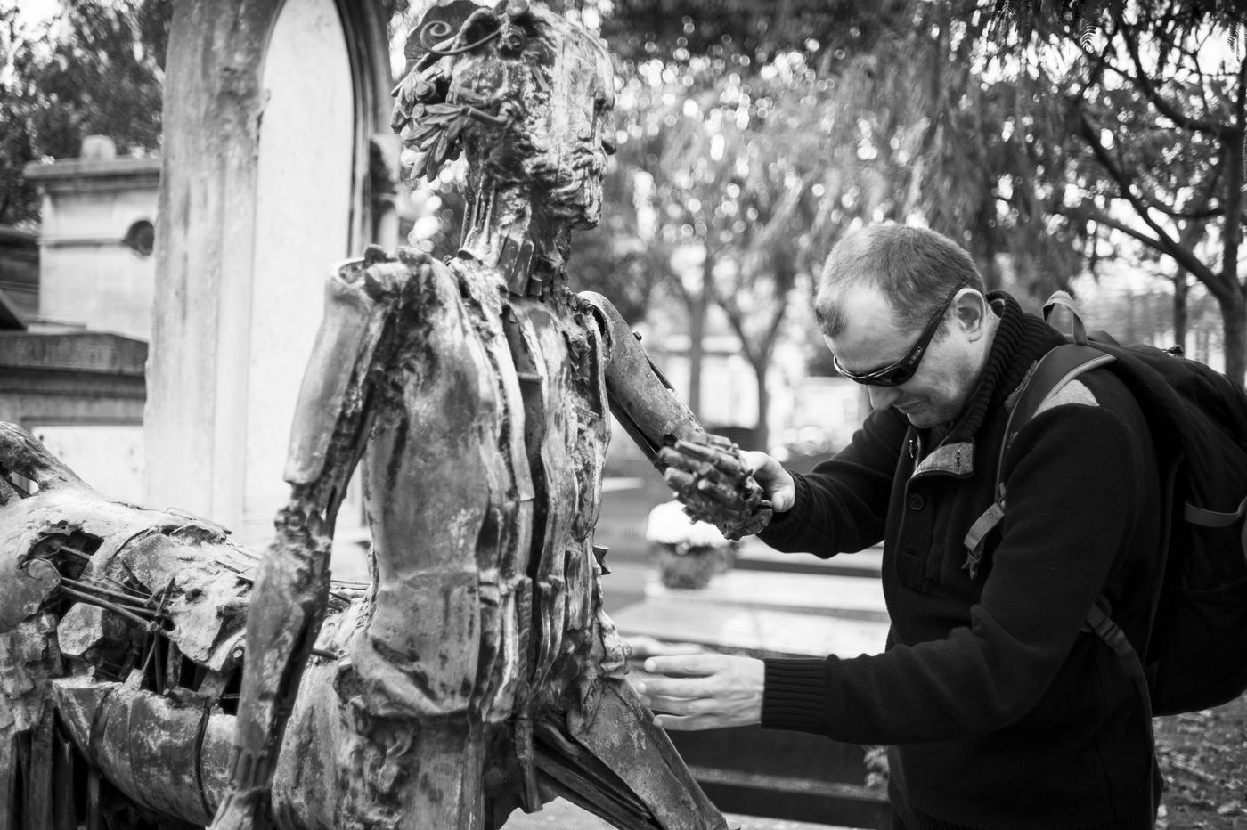 Le 3 novembre 2017, Paris, 14 ème arrondisement, cimetière Montparnasse, Toussaint. Un visiteur aveugle fait une visite tactile et découvre les tombes.
