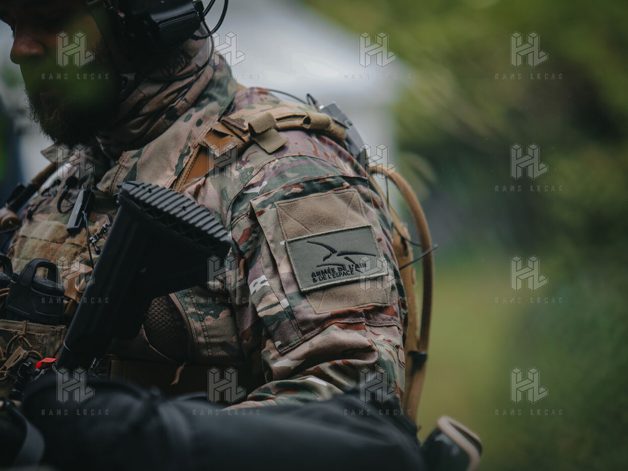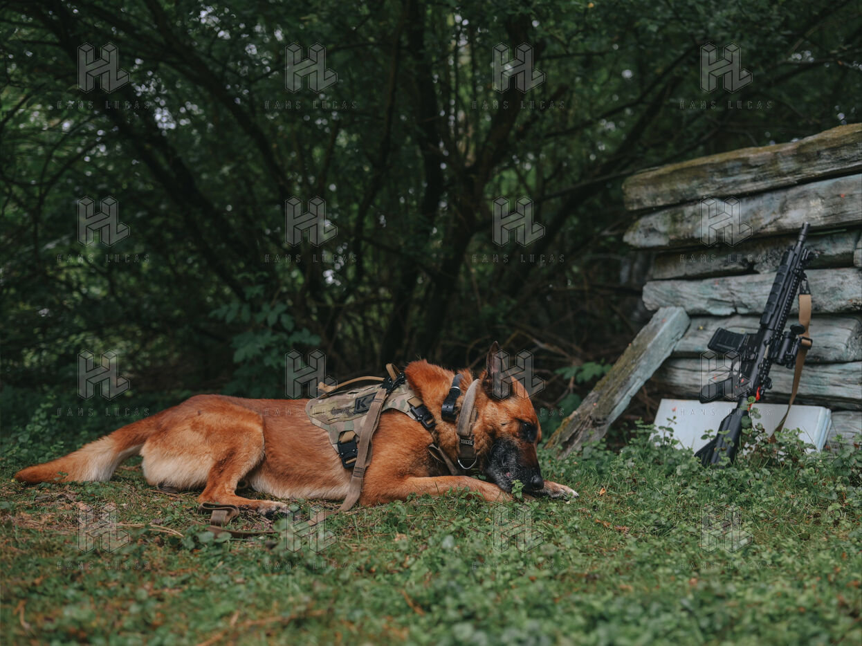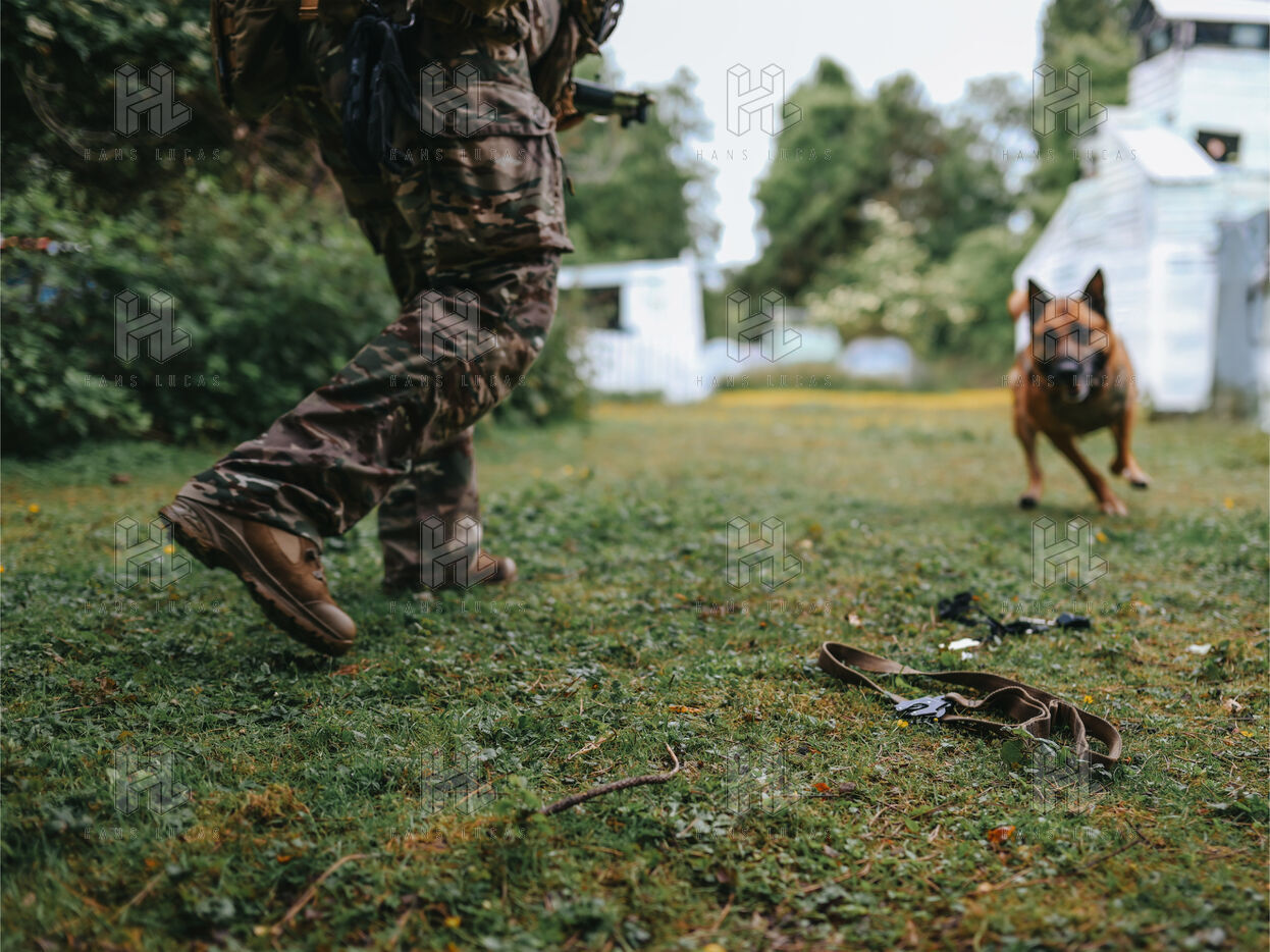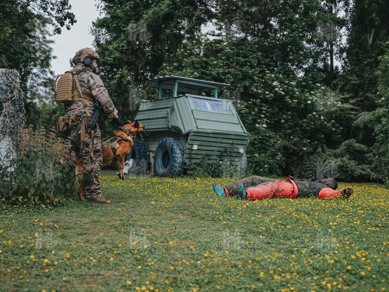 On the warm tarmac of late morning, a dense silence surrounds the operation. Three men, three dogs. And in the sky, a drone hovering quietly. On the ground, Peyo waits — still, focused. Harnessed, wearing tactical goggles, he anticipates the signal. At his side, his handler, Sergeant-Chef Dorian, barely whispers.