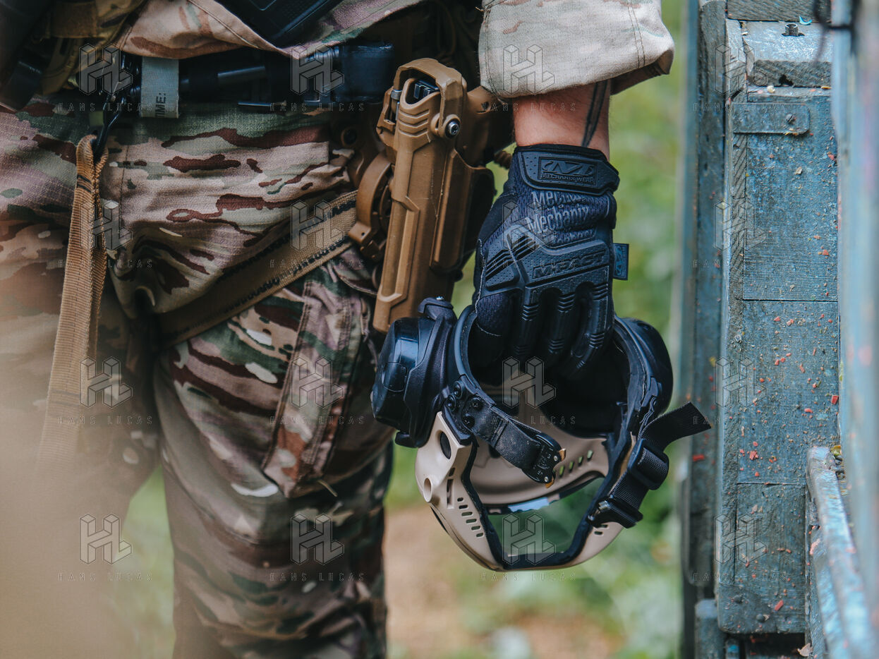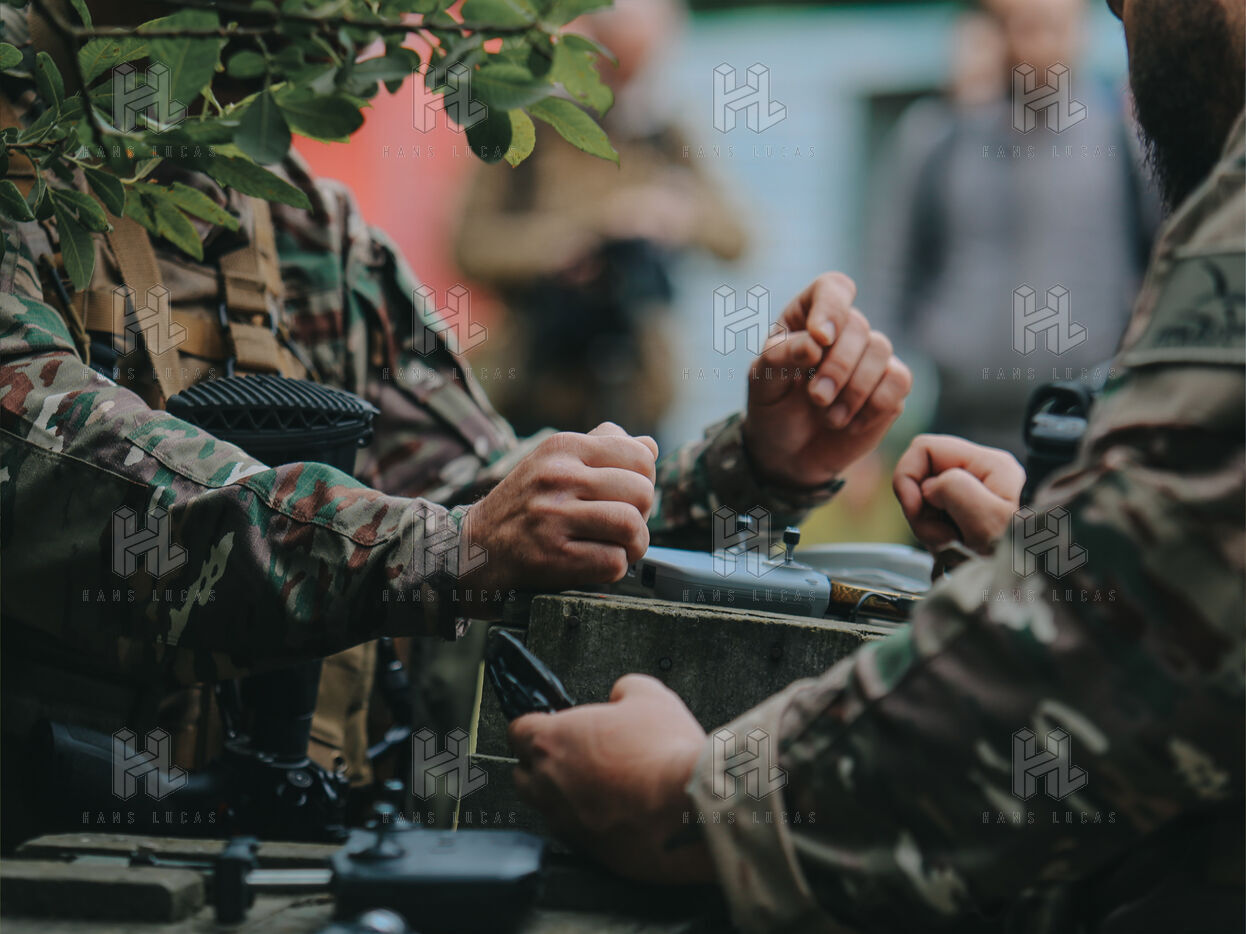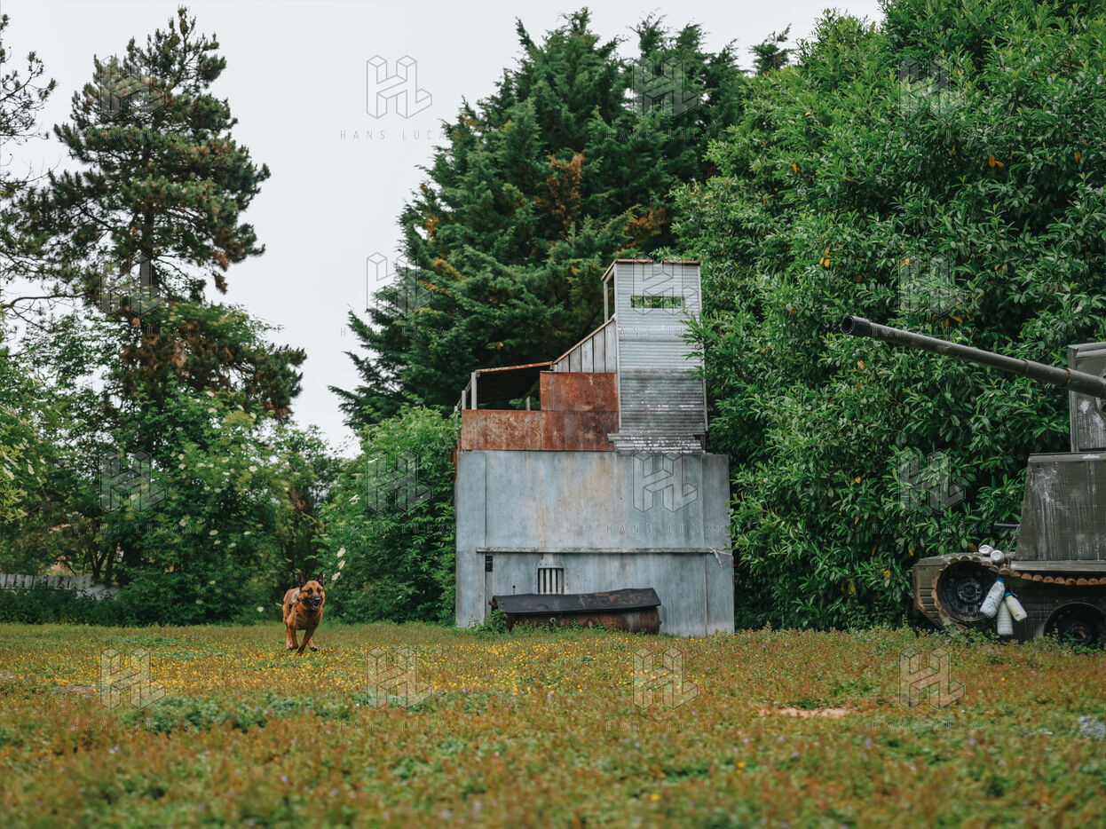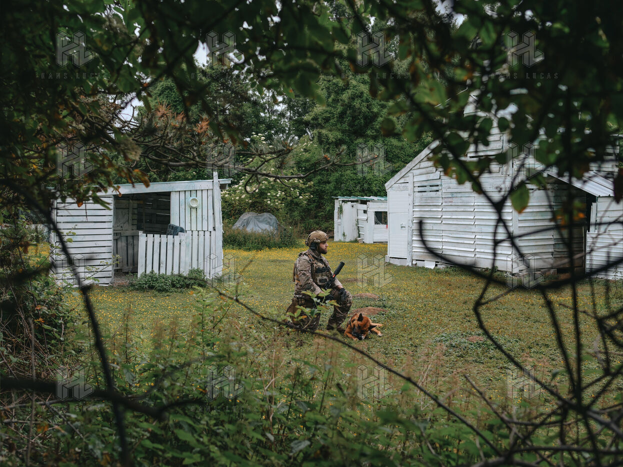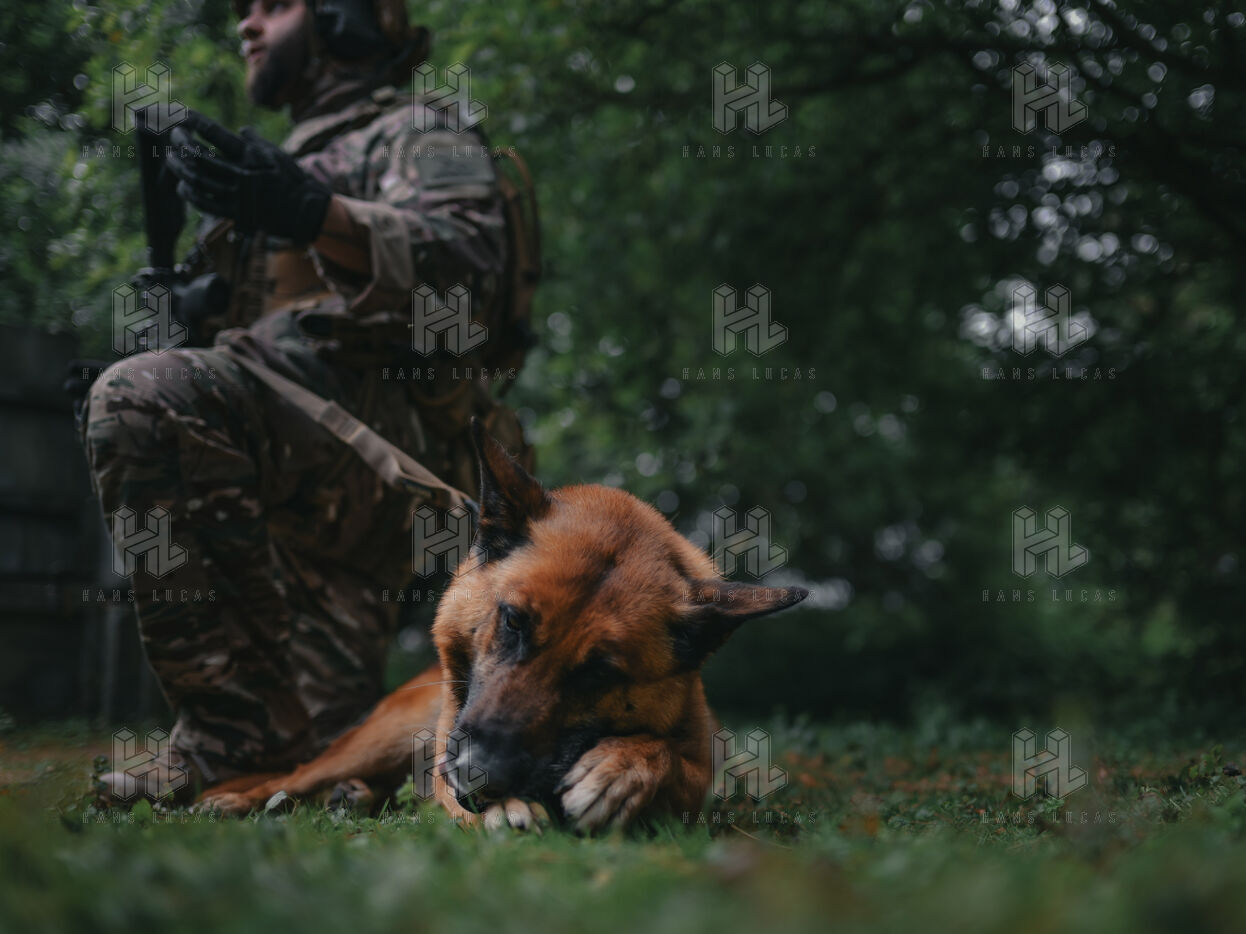 On the warm tarmac of late morning, a dense silence surrounds the operation. Three men, three dogs. And in the sky, a drone hovering quietly. On the ground, Peyo waits — still, focused. Harnessed, wearing tactical goggles, he anticipates the signal. At his side, his handler, Sergeant-Chef Dorian, barely whispers.