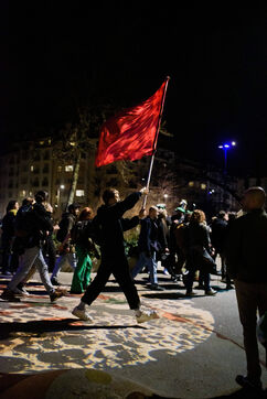France, Strasbourg, 17-03-23. Grosse manifestation sauvage suite à l'utilisation de l'article 49.3 pour faire passer la réforme des retraites. Plus de 1500 manifestants ont défilé pendant plusieurs heures. Nombreuses dégradations sur le trajet, notamment des vitrines, des banques et des panneaux publicitaires. Les vitrines des galeries Lafayette repeintes pour la troisième fois de la semaine.