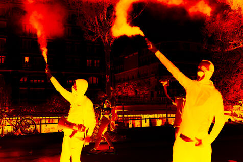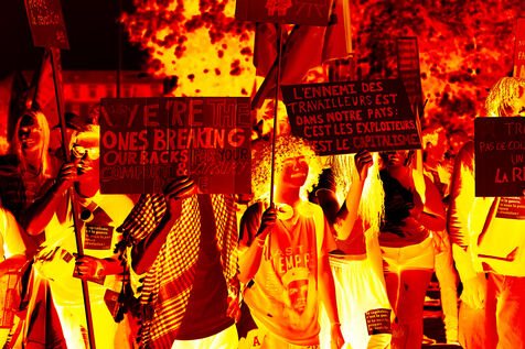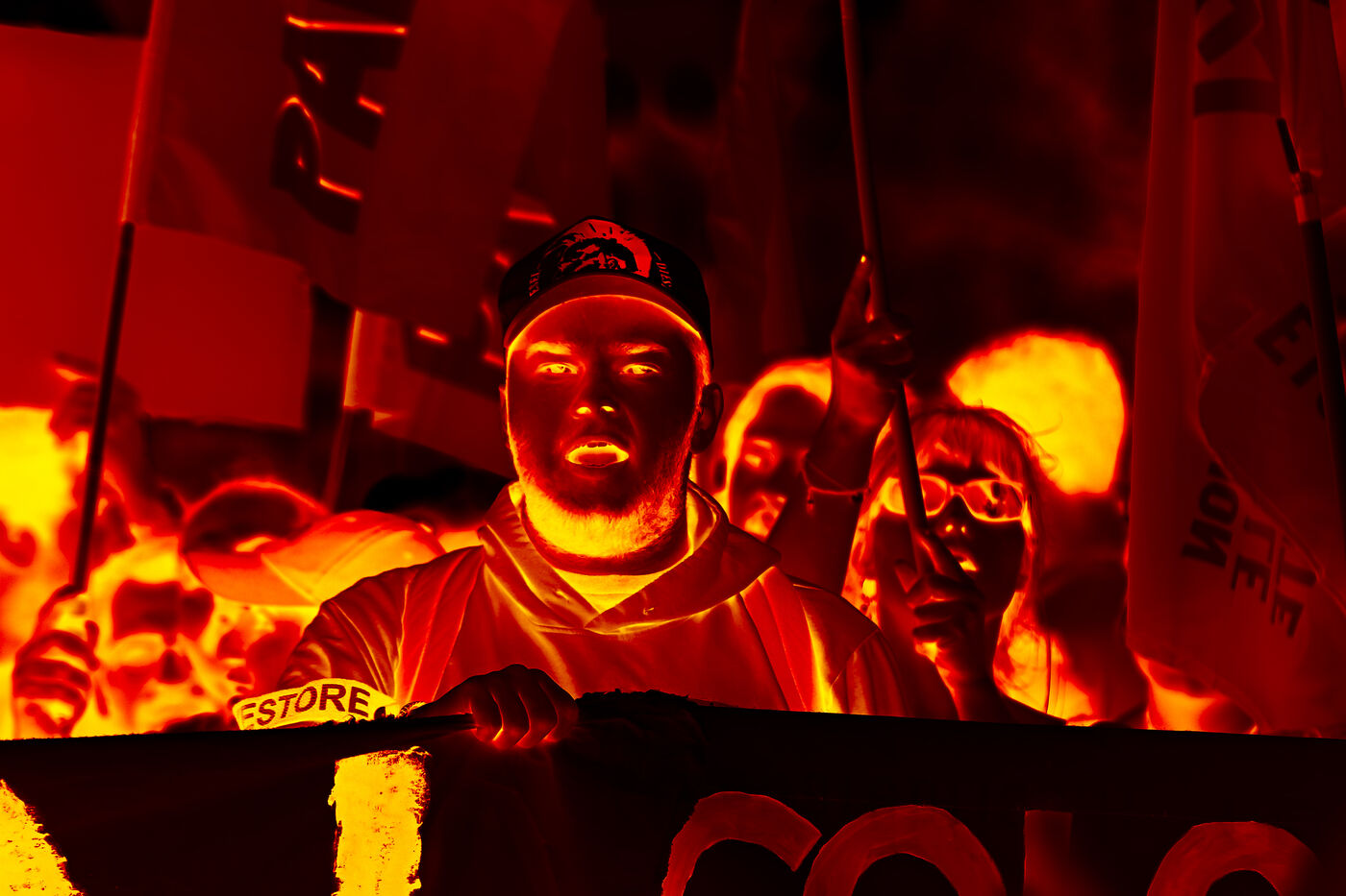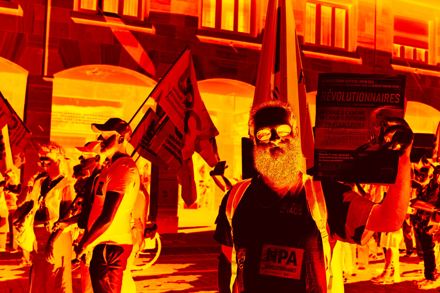 Strasbourg, May 1st 2025. On the ashes of their charred rights, the workers' cortege ignites. A blaze of anger, fueled by precarity and hope. I chose to translate this malaise into burnt, inverted images. In the negative, bodies become flames, and words appear with clarity. A muted tension, rekindled by every social setback.