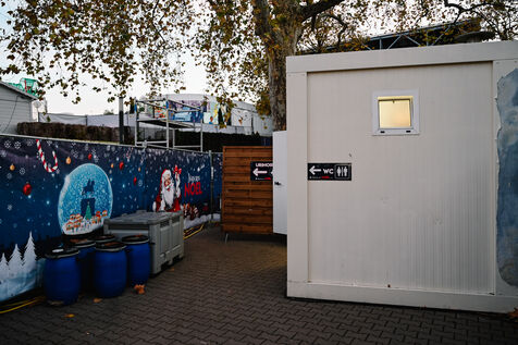 But around the back of the chalets, a different picture emerges. Behind wooden facades and fences, pallets, empty boxes, and trash bags pile up. Electrical boxes, hanging cables, open manholes, and “High Voltage” barriers reveal the invisible machinery that sustains the dream.