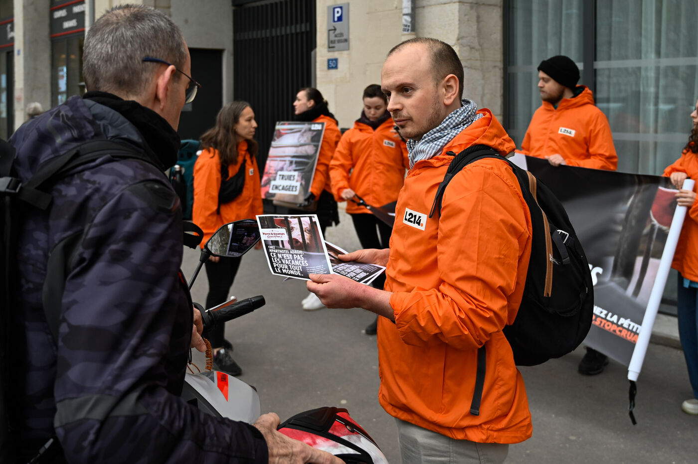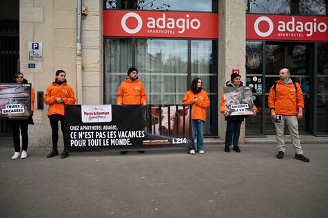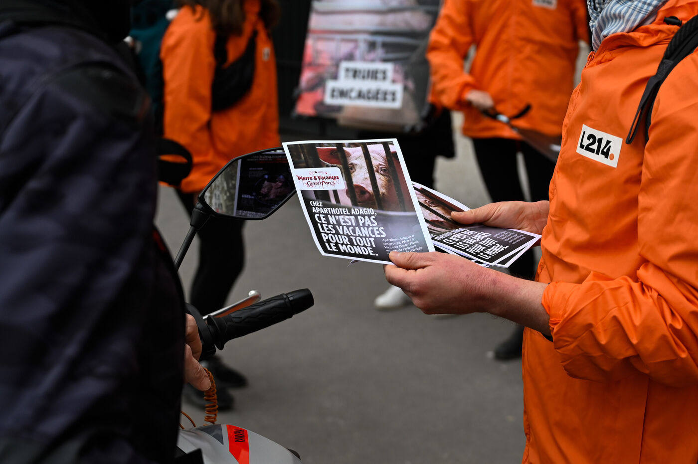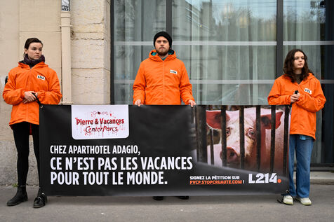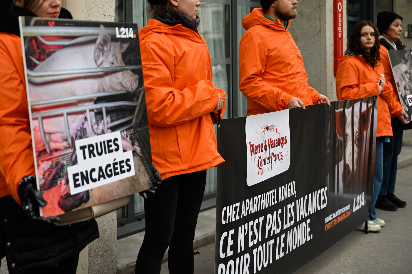 This December 10, 2025, activists from the association L214 gathered in front of the Aparthotel Adagio, in the Confluence district of Lyon, to denounce the intensive farming of breeding sows. The demonstrators called on the Pierre & Vacances Center Parcs group to commit to ending the use of gestation and farrowing crates.