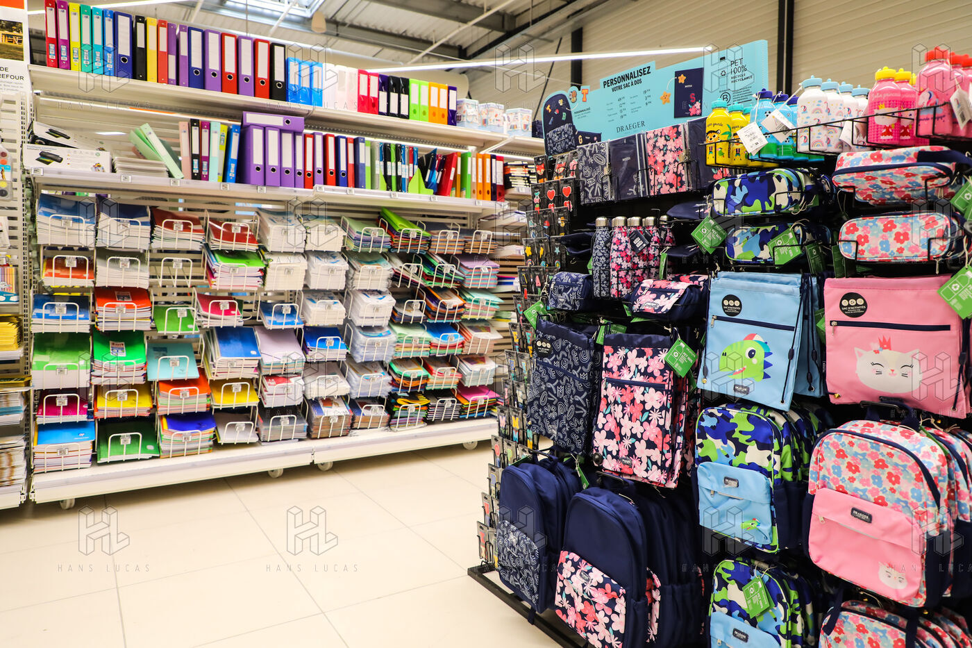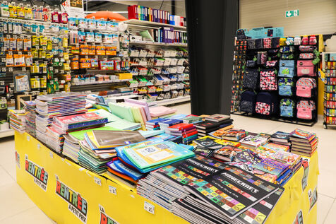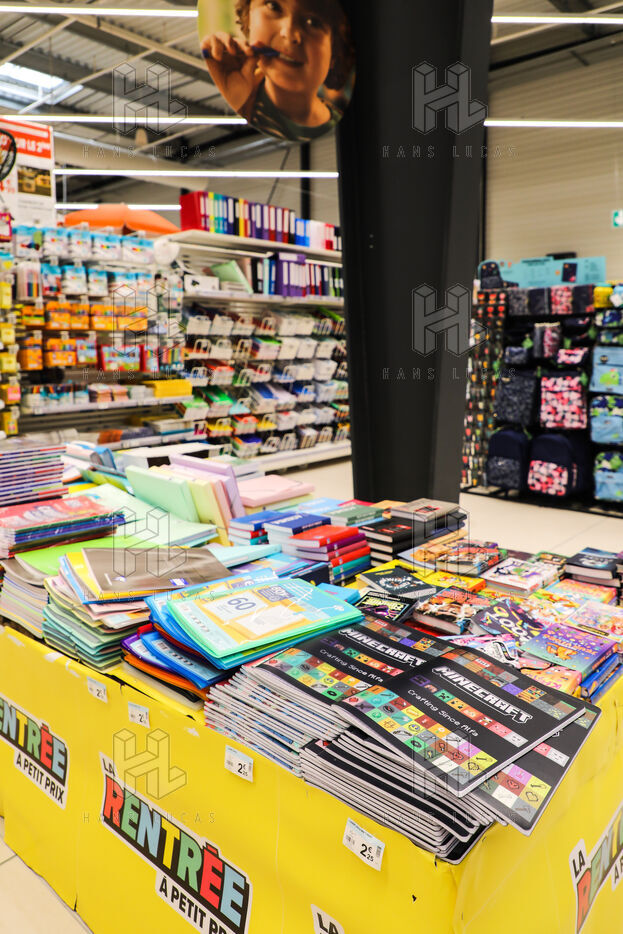 A section of school supplies for the start of the school year in September in a supermarket in the Aude, Côte du midi.