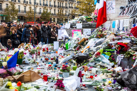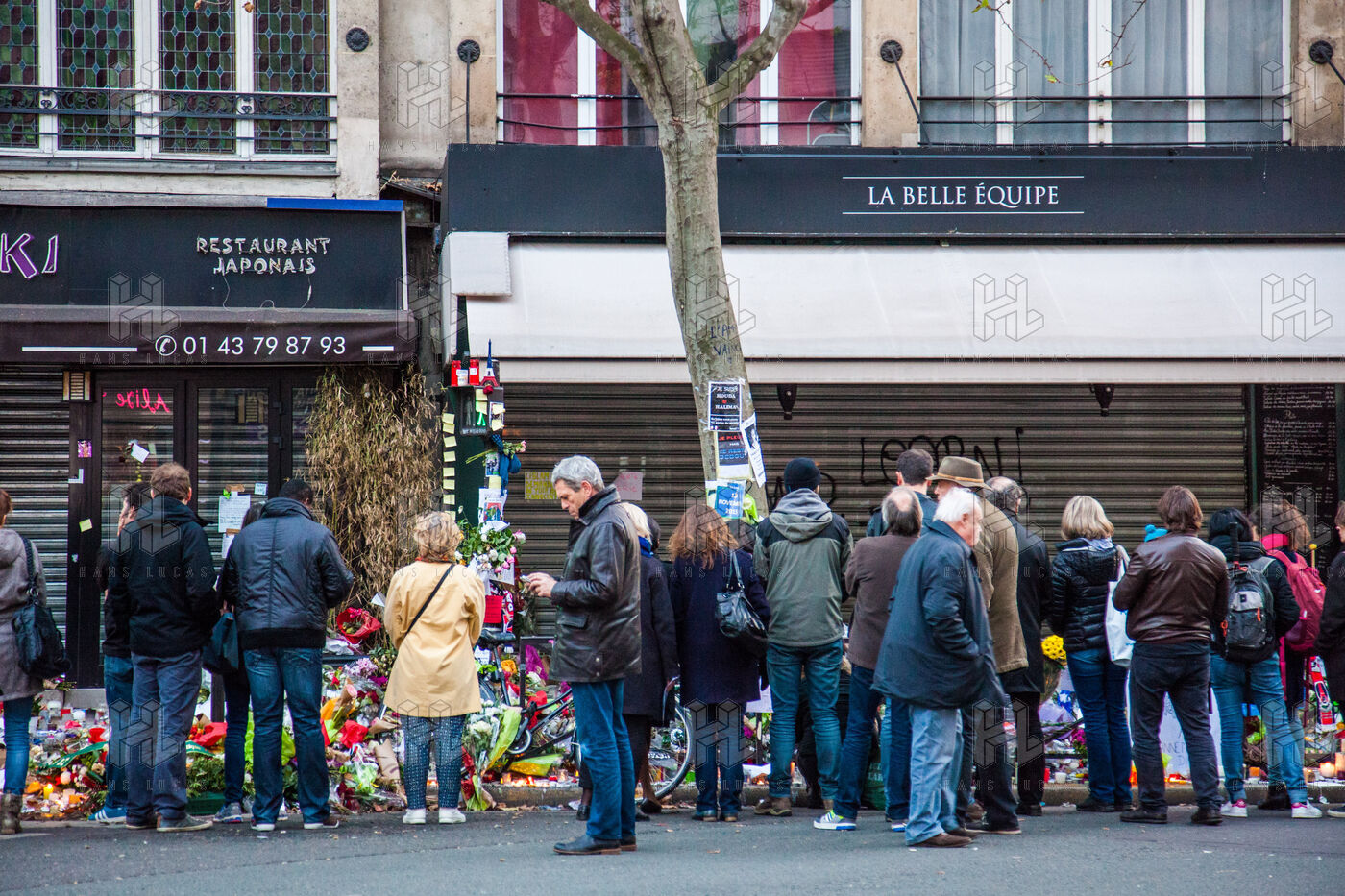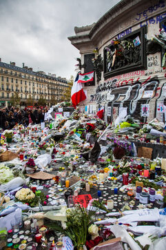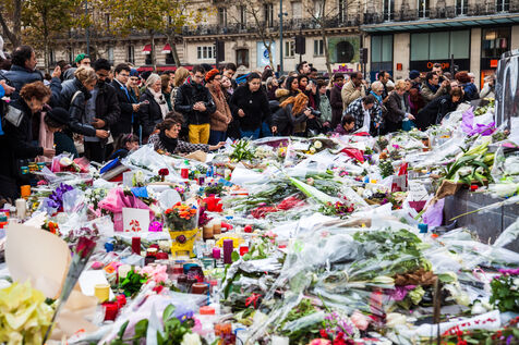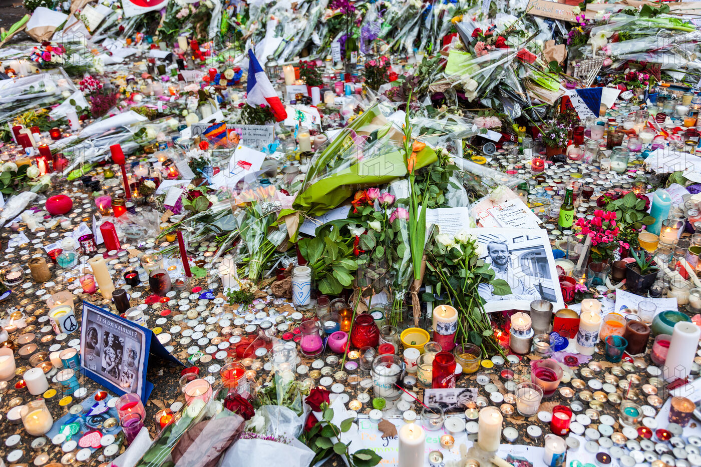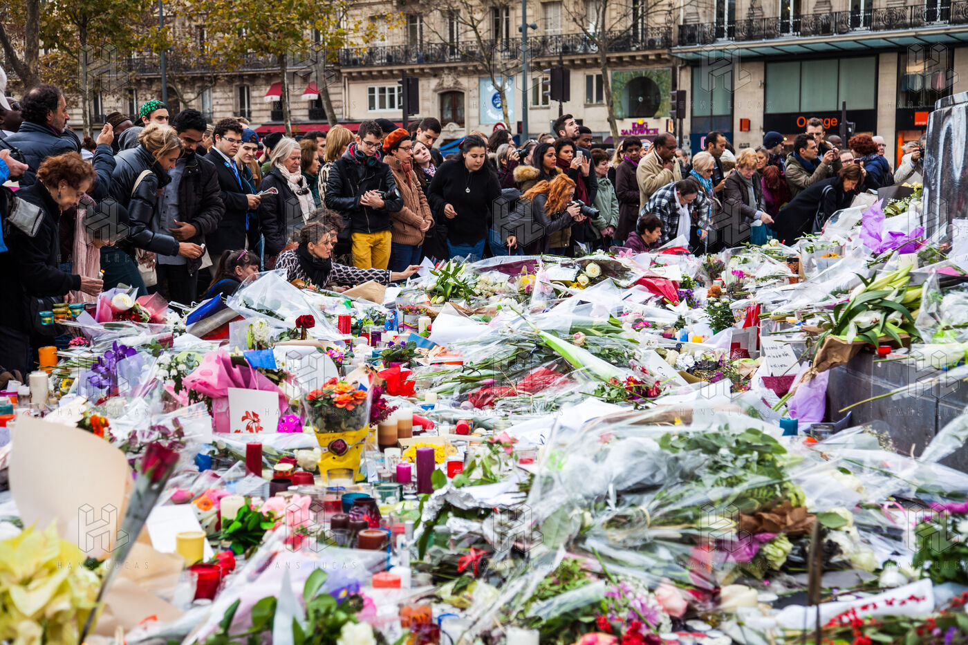Suite aux attentats terroristes islamistes coordonnés du 13 novembre 2015, revendiqués par le groupe Daech, qui ont fait 130 morts et des centaines de blessés, la population a témoigné d'un élan d'hommage et de solidarité exceptionnel. Des autels spontanés de fleurs, de bougies, et de messages ont recouvert les trottoirs et les places, notamment à la Place de la République, symbolisant le deuil et la résistance de la nation. Ces attaques ont frappé plusieurs lieux emblématiques de la vie parisienne et en banlieue : le Stade de France (Saint-Denis) avec trois explosions-suicides qui se sont produites aux abords du stade pendant un match de football amical, le Bataclan où l'attaque la plus meurtrière a eu lieu et où un commando a tiré sur la foule et pris des otages, les terrasses de plusieurs bars et restaurants (10e et 11e arrondissements) où des tireurs ont ouvert le feu sur les clients (Le Carillon, Le Petit Cambodge, La Bonne Bière, Casa Nostra, La Belle Équipe). Au Comptoir Voltaire, un kamikaze s'est fait exploser. Ces attentats, visant des lieux de rassemblement et de culture, ont été la séquence terroriste la plus meurtrière de l'histoire de France.