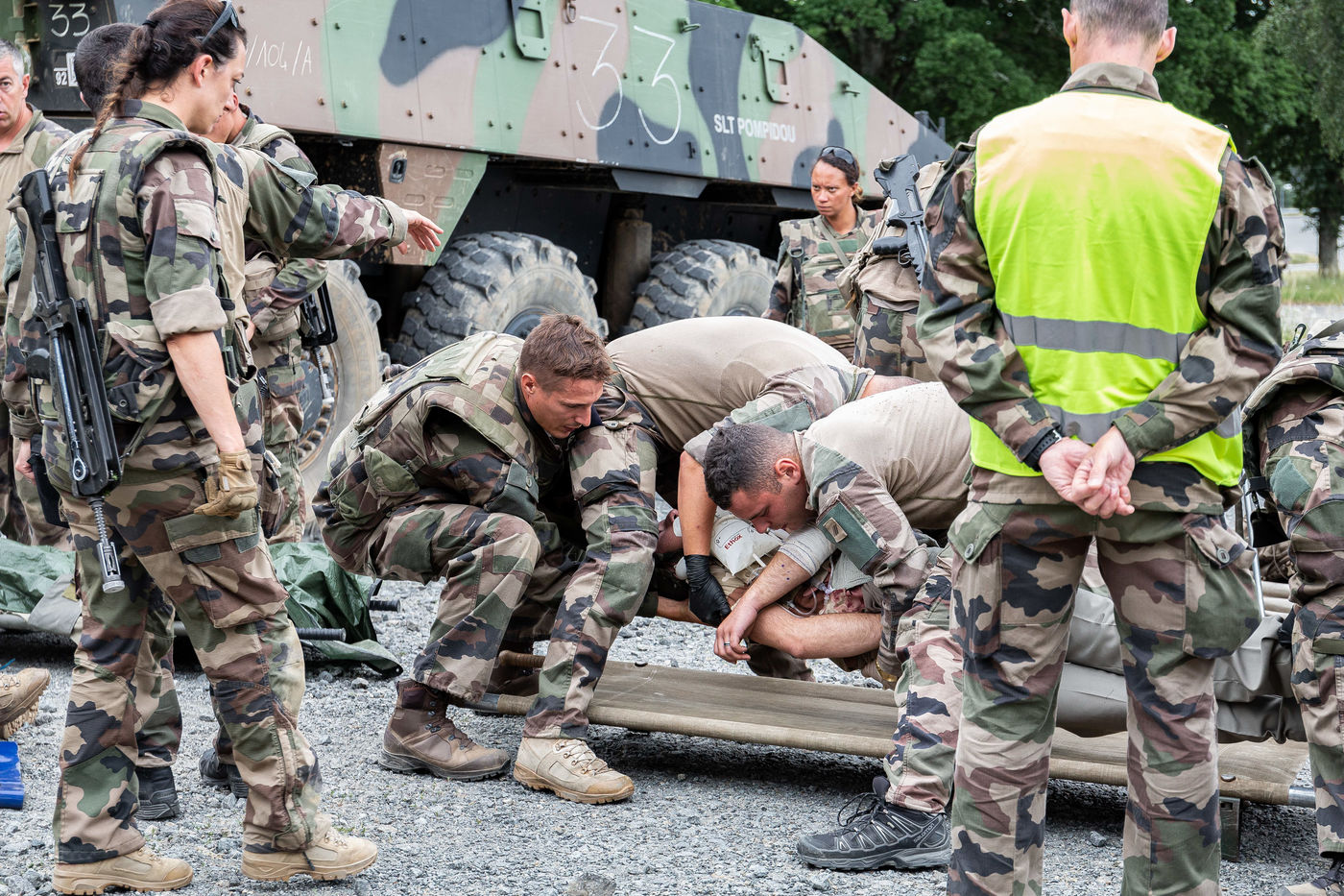 Training on the medical care of the wounded during an external operation of the French Army. The French Army Medical Corps is present during these trainings as well as the combat companies ready to be projected on the theatres of war.
