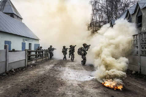 Combat training in an urban area for an Army unit prior to its projection in external operations. Between taking up a position in a village created for this training, searching buildings and defending an area, the unit spends fifteen days training and evaluating to ensure that the unit is operational.