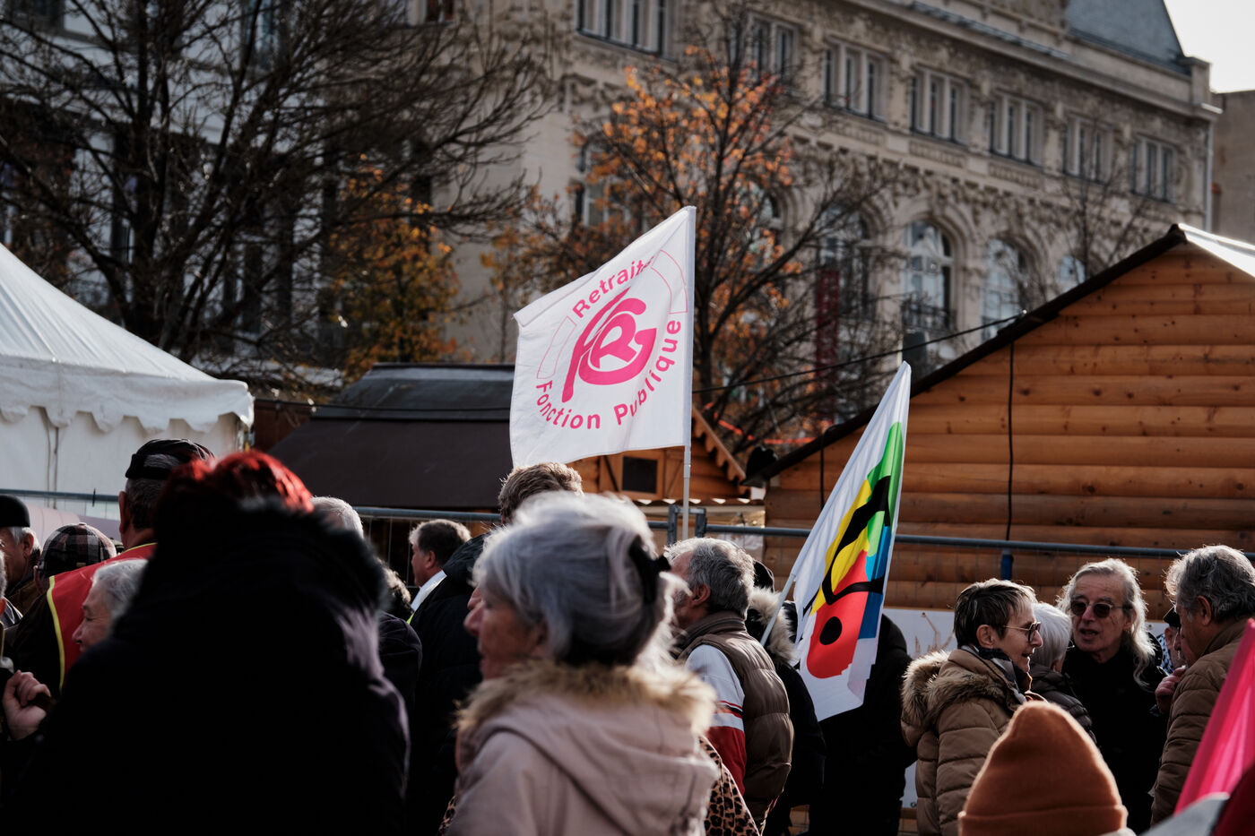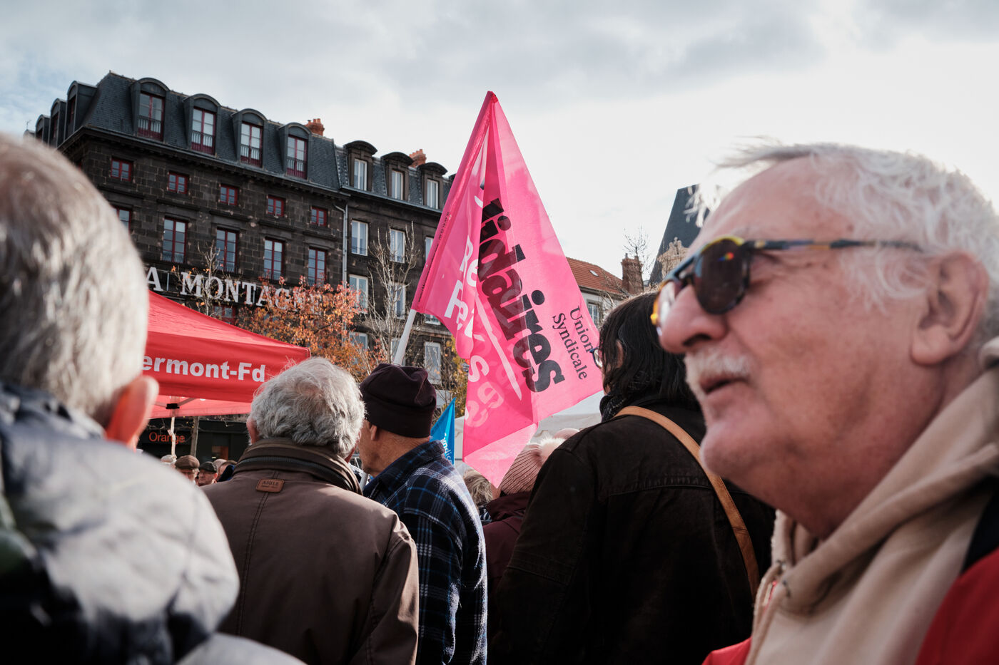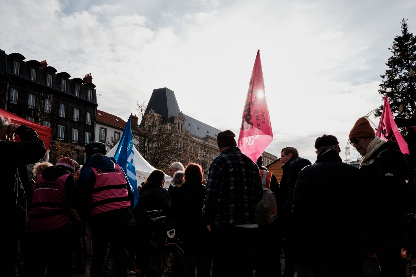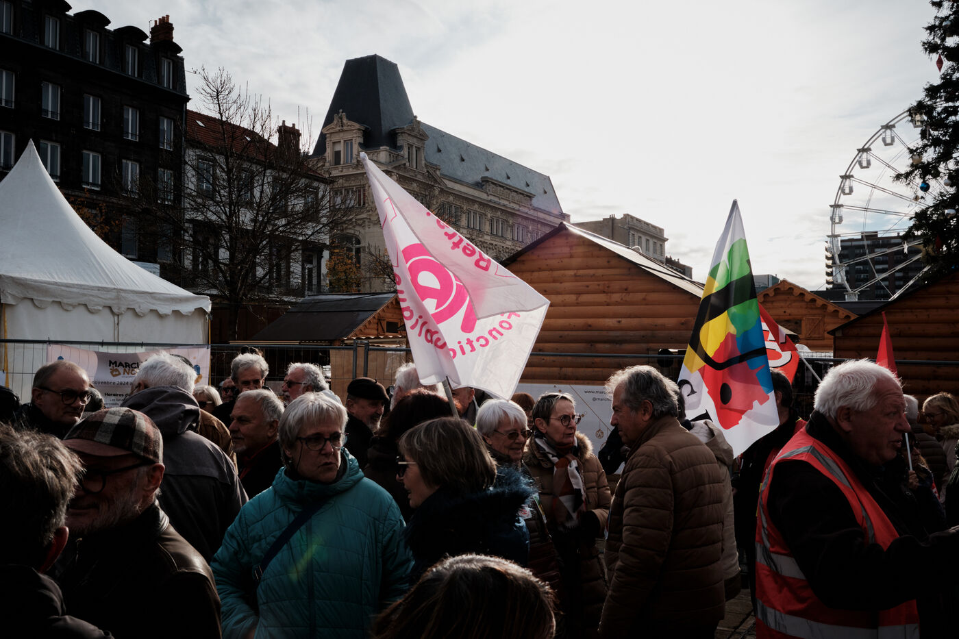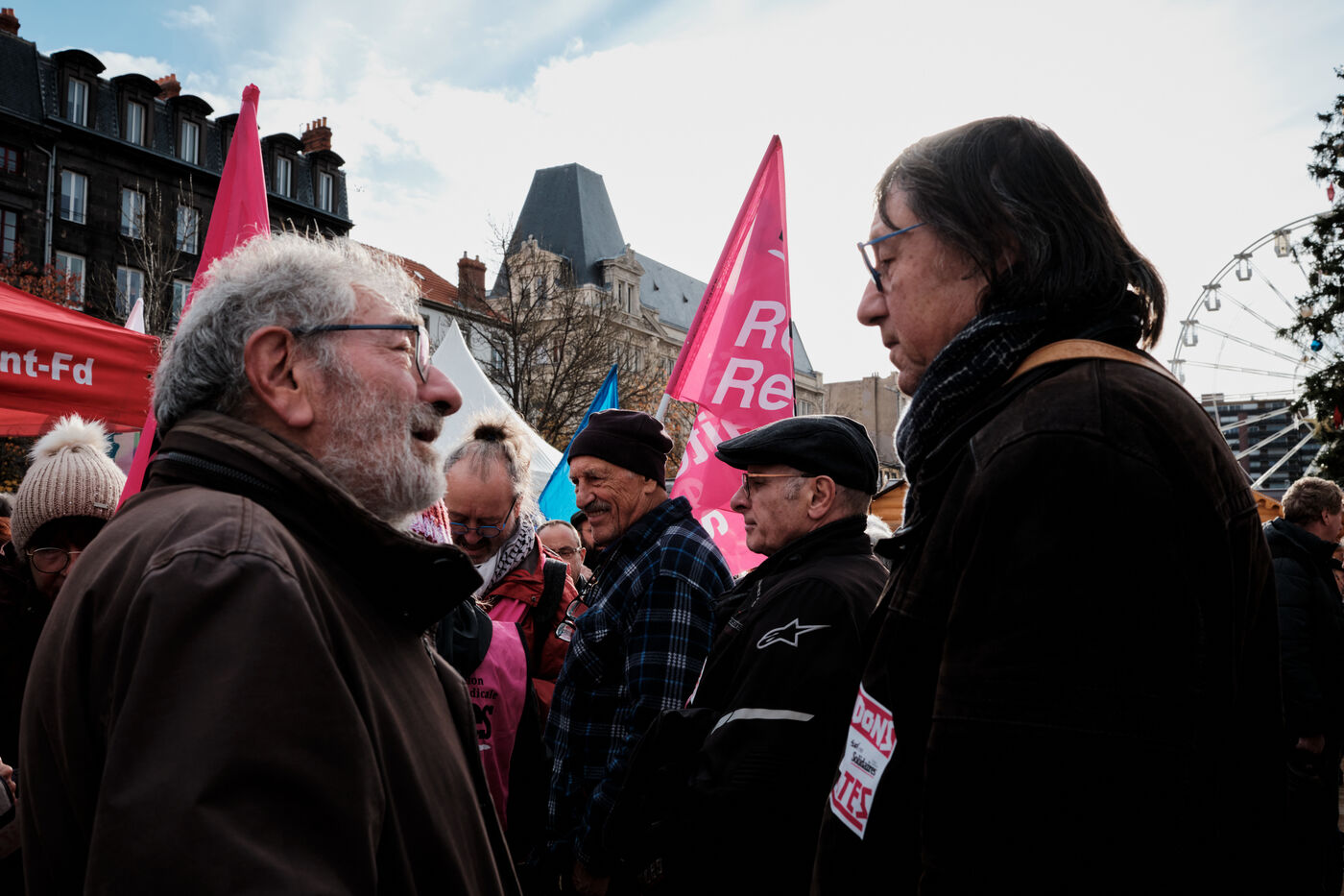 A l appel de 10 organisations syndicales, des retraites du Puy de Dame se sont réunis place de Jaude a Clermont Ferrand. C est a cote du marche de Noel clermontois qu ils se sont réunis pour demander une revalorisation de leurs pensions du montant de l inflation au 01 Janvier 2025. Les retraites exigent aussi le rattrapage des pertes du pouvoir d achat subies depuis 2017 ainsi qu un niveau de pension minimum égal au SMIC.
