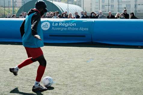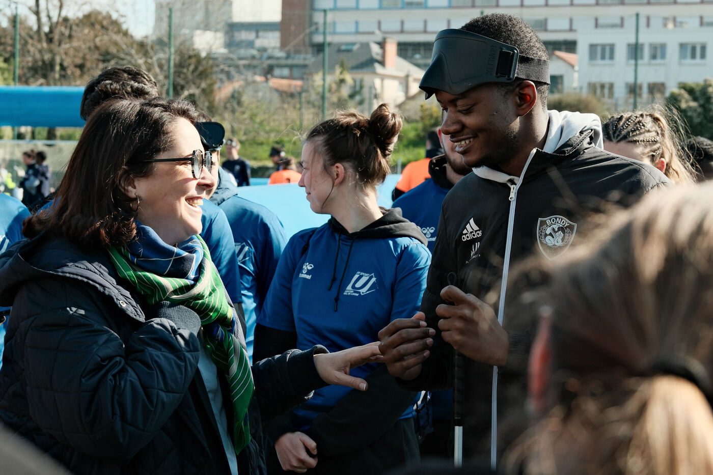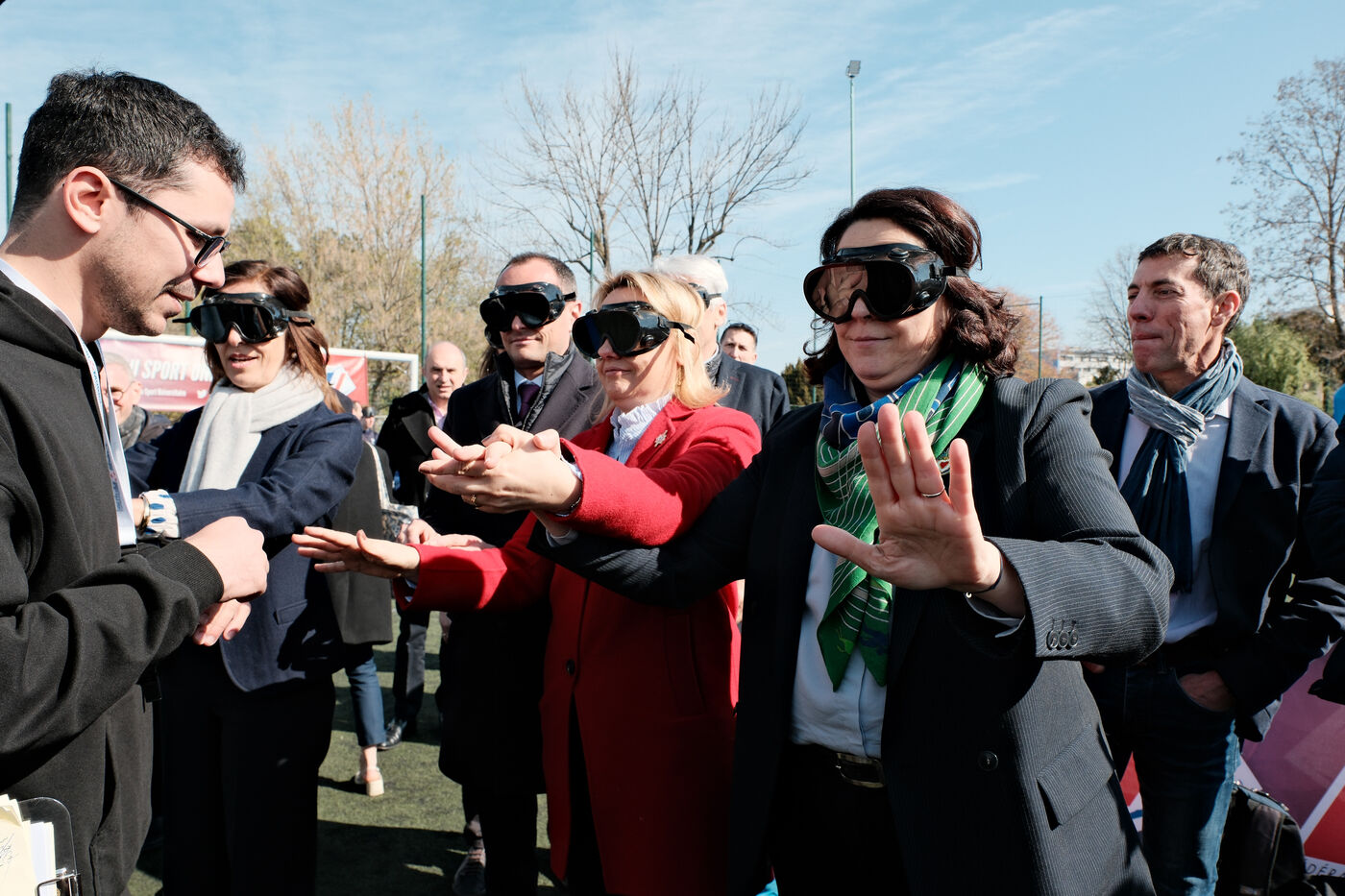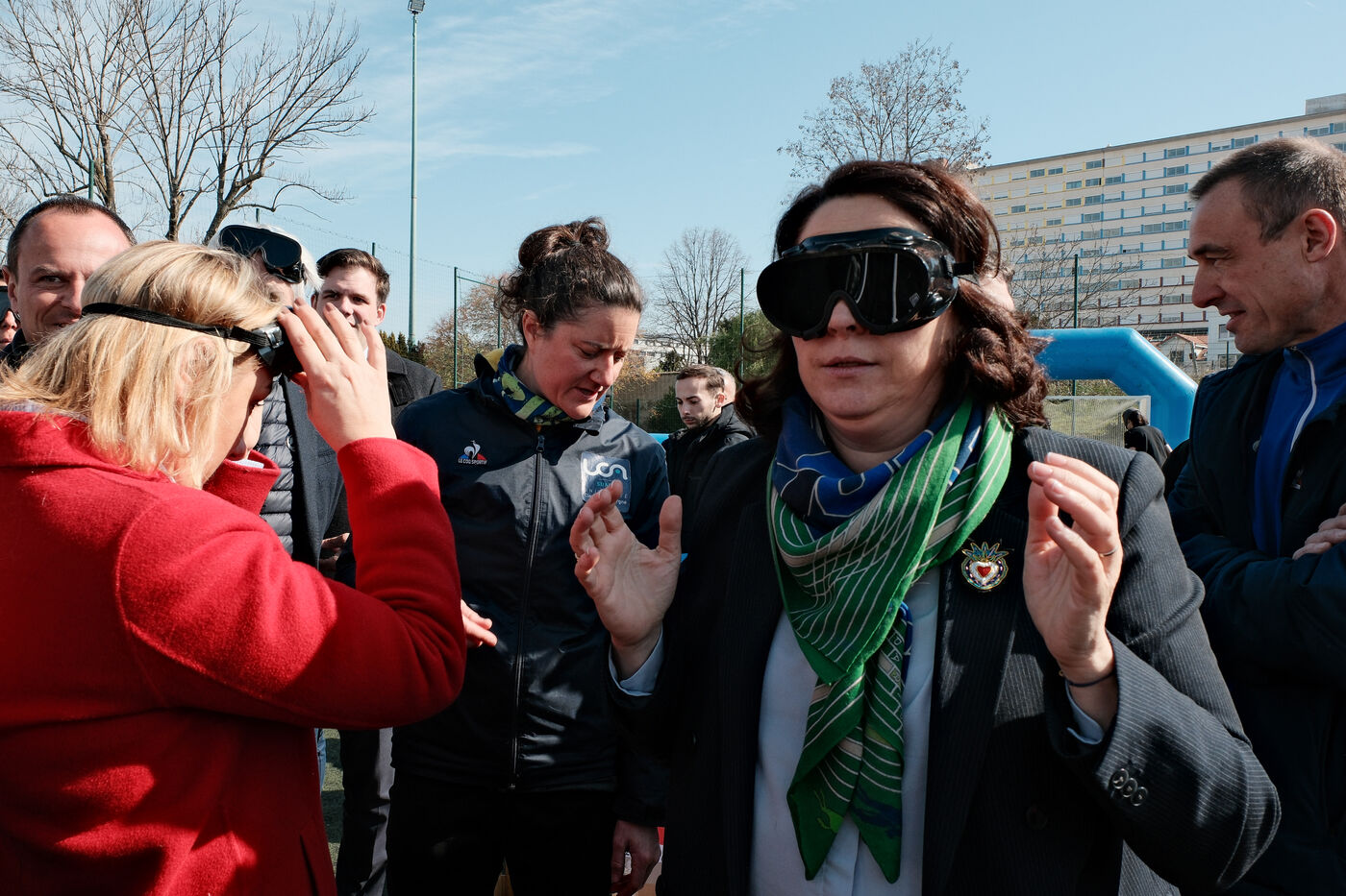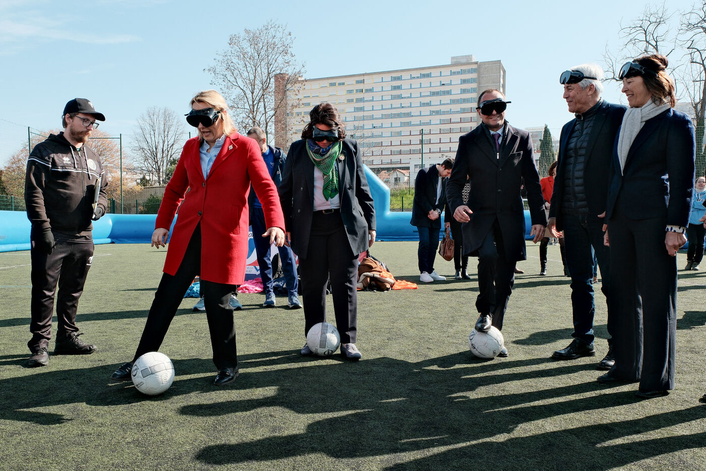 Visite de la ministre des Sports Marina Ferrari au stade universitaire de Clermont-Ferrand dans le cadre de la Semaine Olympique et Paralympique (SOP), pour un déplacement consacré à la promotion du sport scolaire et universitaire. Elle participe à une initiation au cecifoot, puis visitera le complexe sportif Philippe Marcombes en compagnie du maire de CLermont Ferrand Julien Bony accompagné de Monsieur Burnichon, directeur des sports de la ville de Clermont-Ferrand.