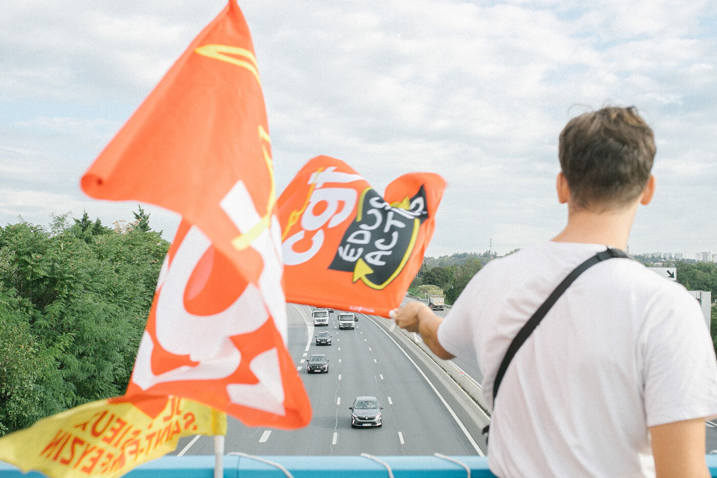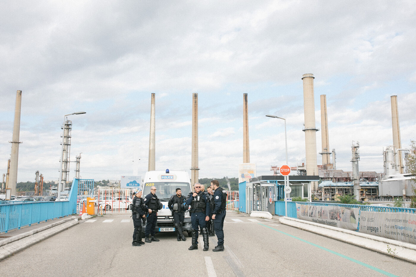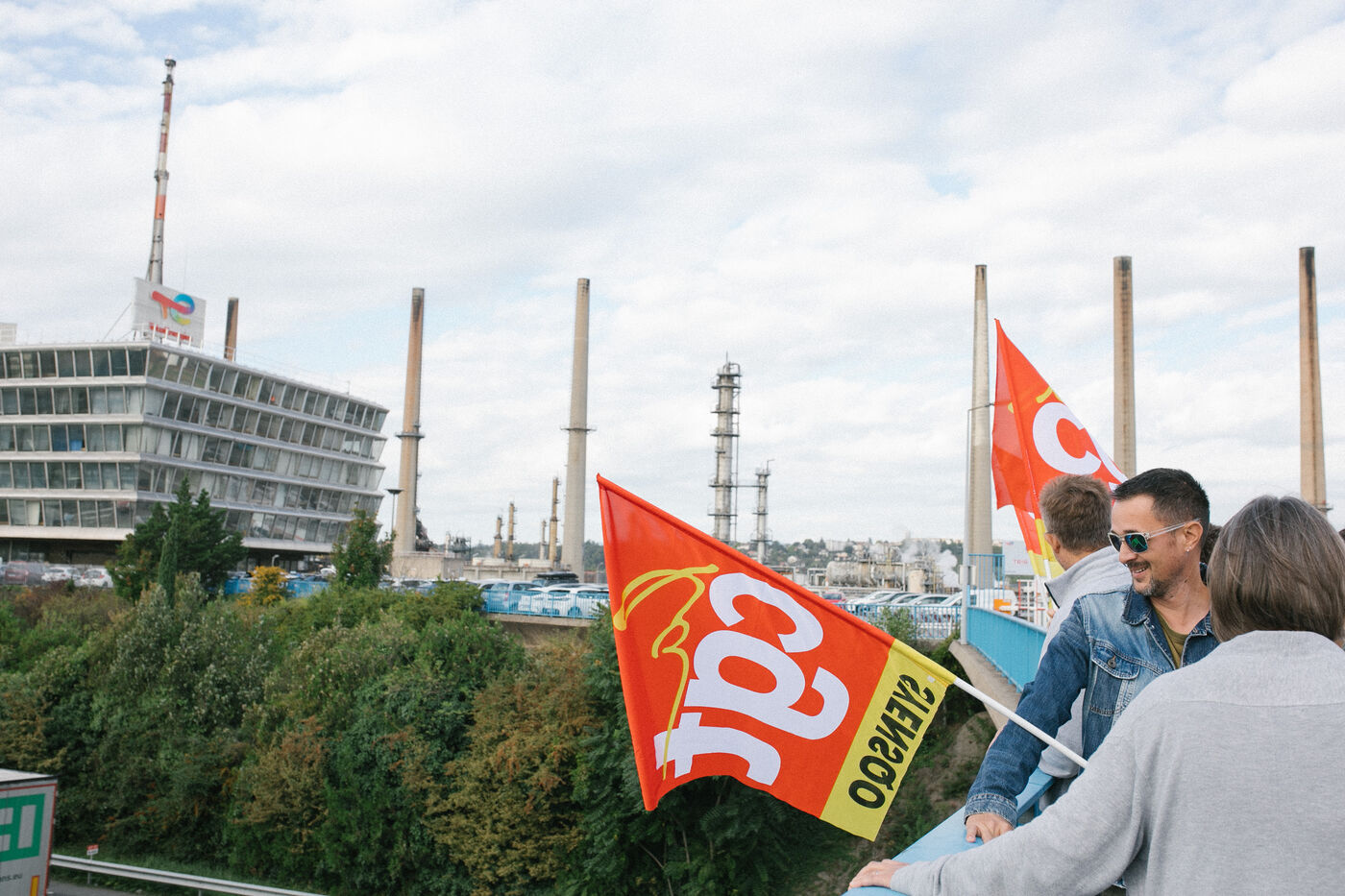 FRANCE - Lyon, mercredi 10 septembre 2025, piquet de grève et manifestants devant la raffinerie Total à Feyzin organisé par le syndicat CGT. Photographie de Marie Julliard / Hans Lucas.