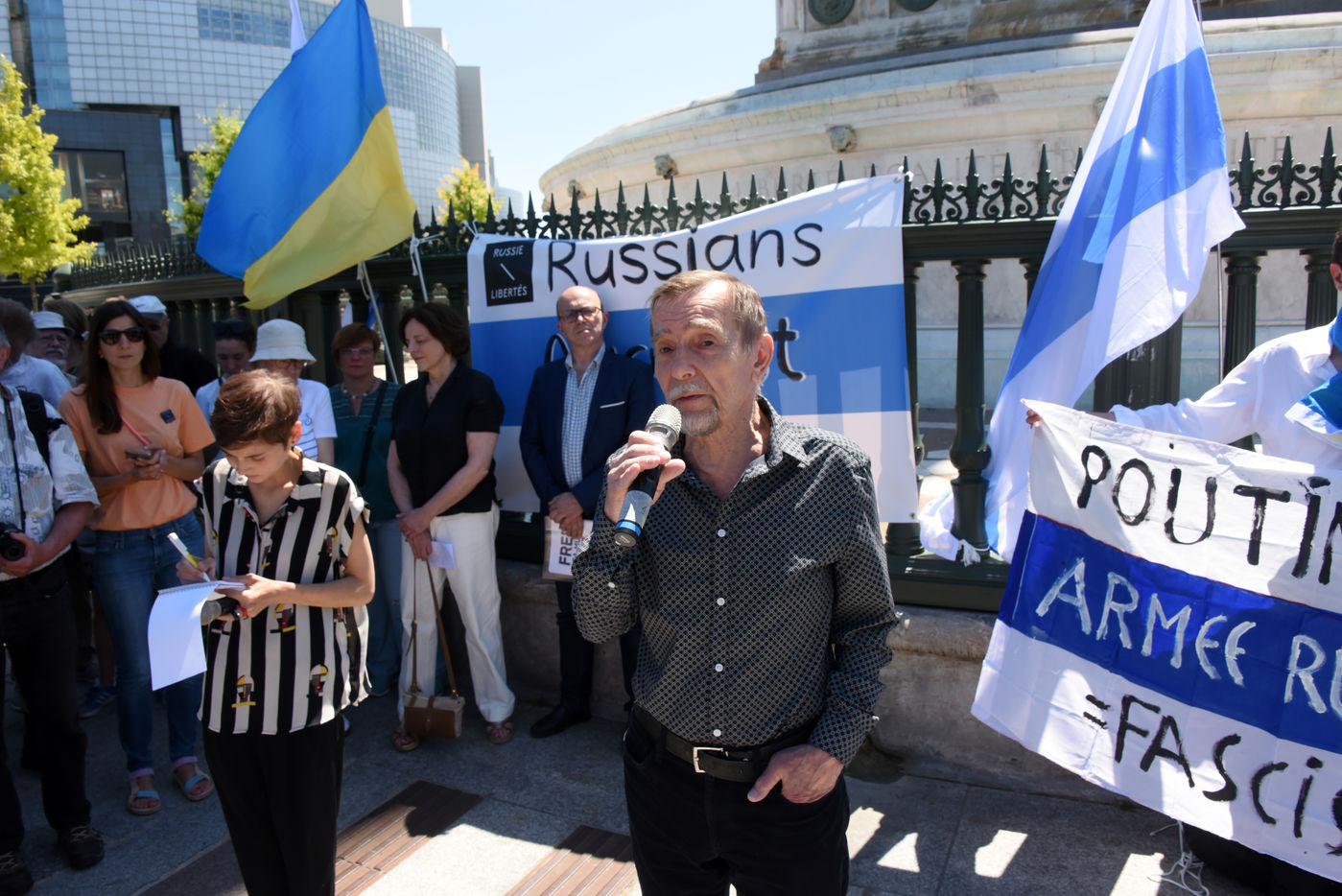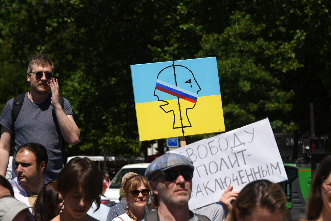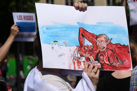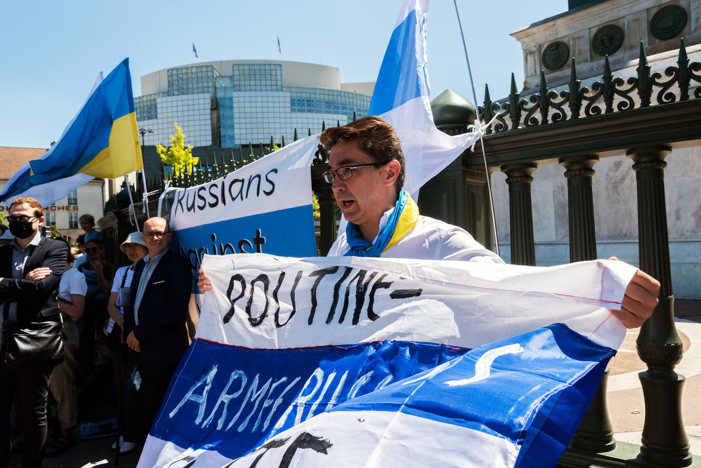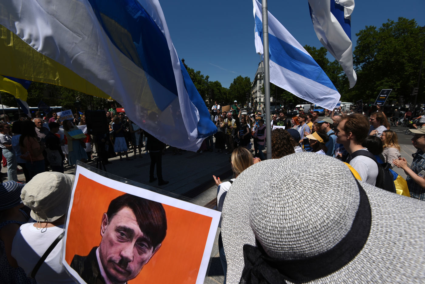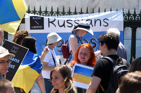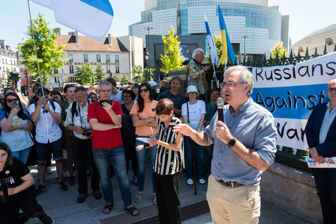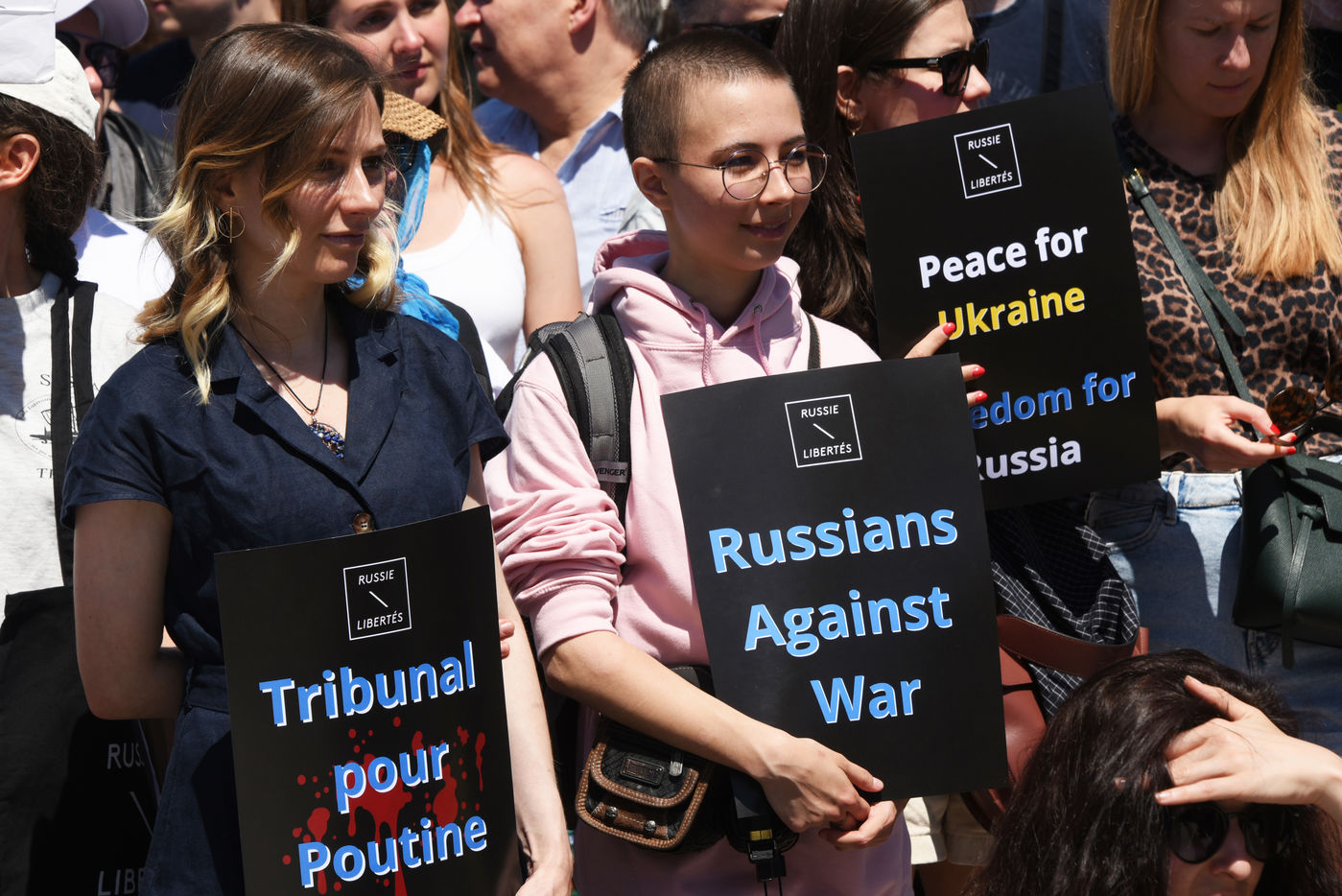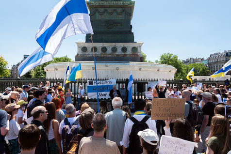 People protesting against the war with Ukraine during Russia day. Hundreds of people gathered for the protest action «Russians against the war», which took place on Place de la Bastille in Paris.