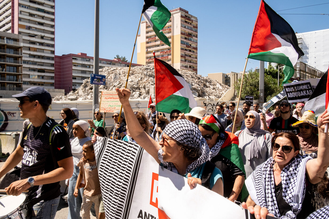 Several hundred people demonstrated from the working-class district of La Paillade to Place de la Comédie in Montpellier on Saturday 17 May to commemorate the 77th anniversary of the start of the Nakba and call for an end to the genocide in Palestine.