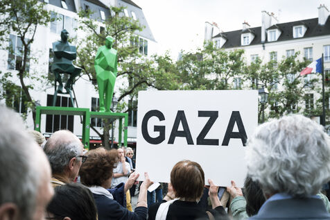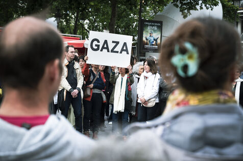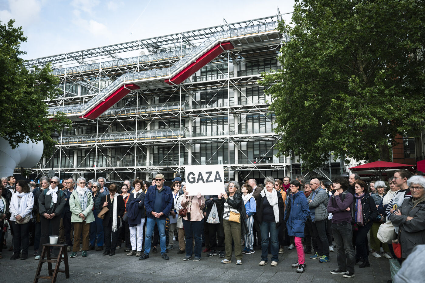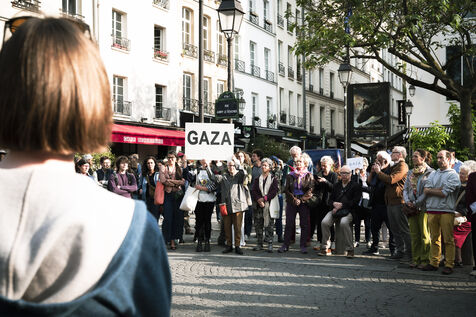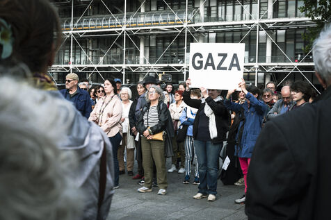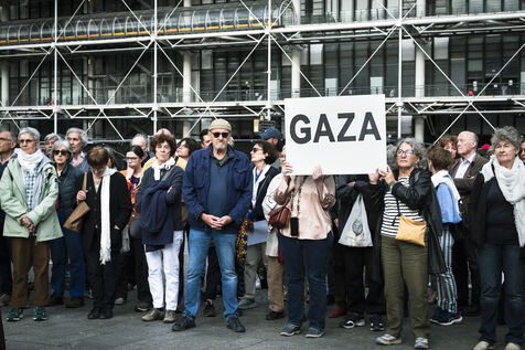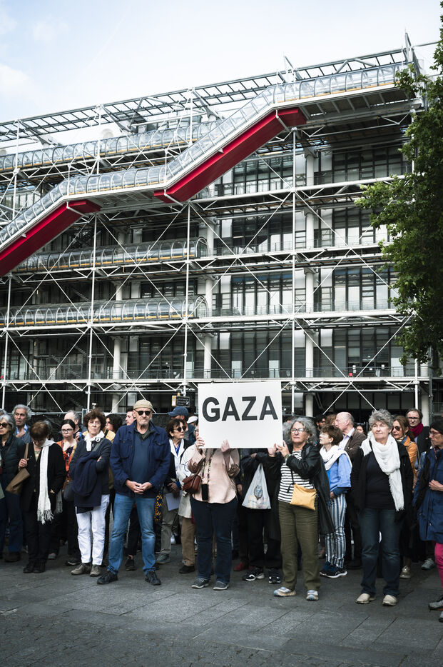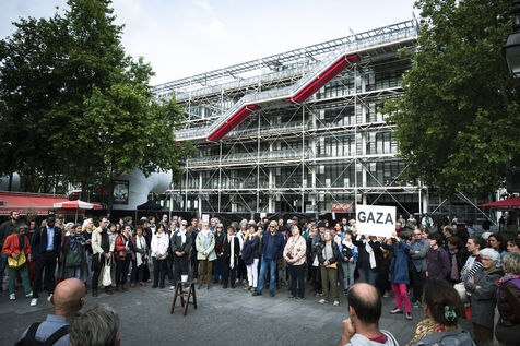 Our silence is a cry" rally in Paris at Place Beaubourg in support of Gaza. Participants remained silent for 30 minutes in protest. A manifesto was signed by a number of public figures, including Claire Nouvian, Yann Arthus-Bertrand, Hervé Kemph and Lilian Thuram.