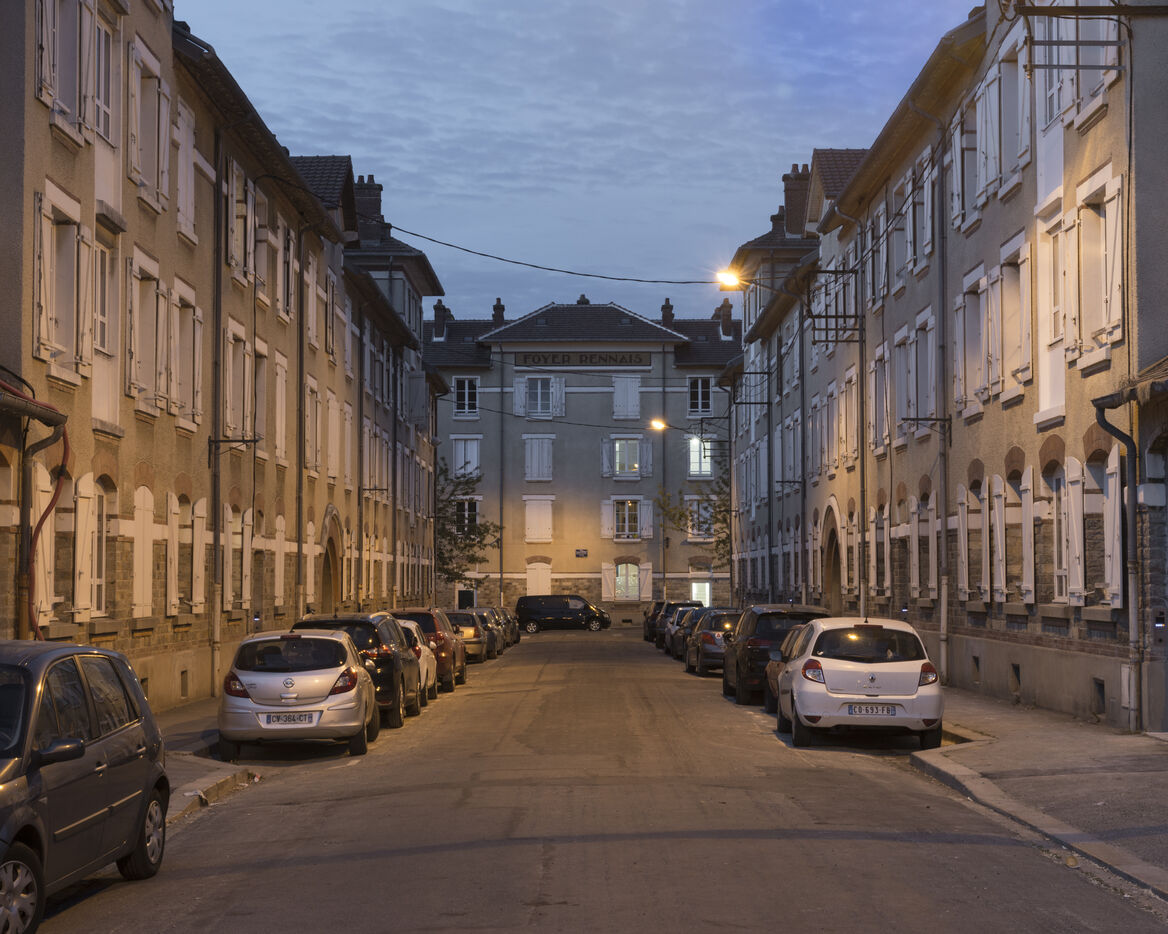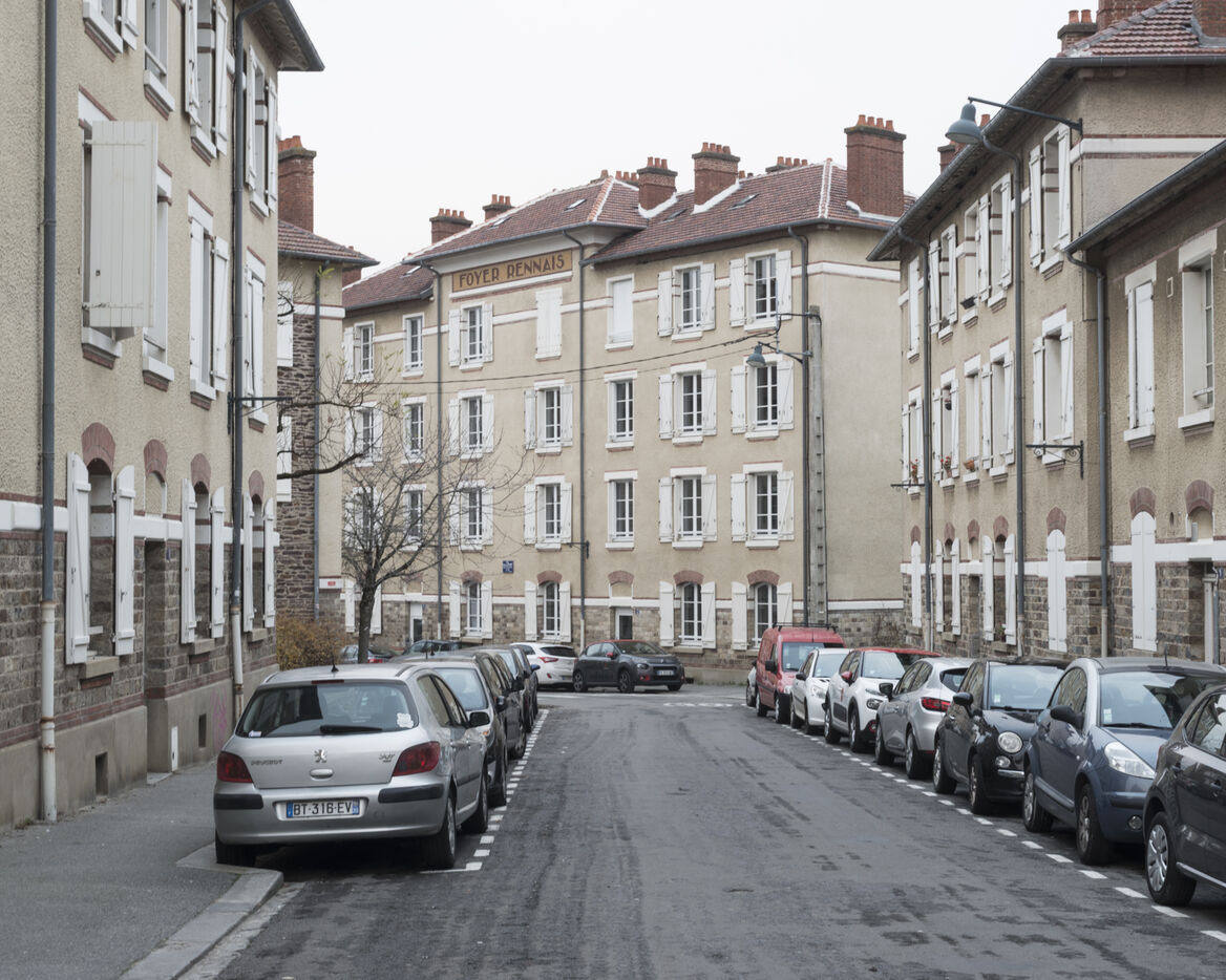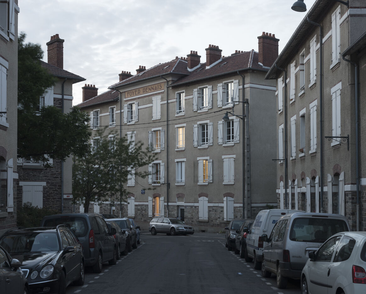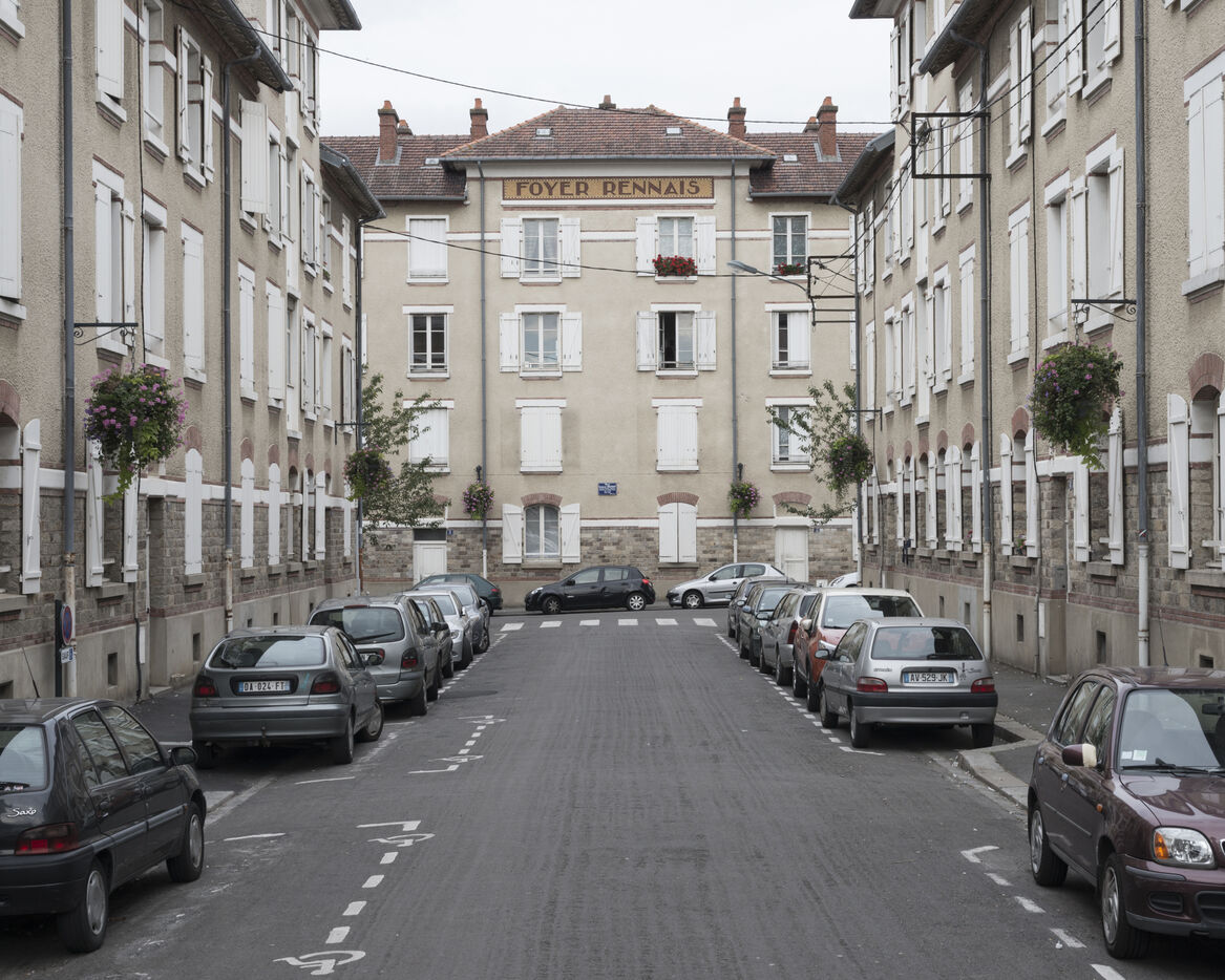 Réalisé entre 1928 et 1933, le Foyer rennais, un ensemble de 155 logements, situé rue de Nantes à Rennes, est la toute première construction sociale de Rennes. Esquissé tout d’abord par Hyacinthe Perrin, le projet de cette cité ouvrière est finalement confié à l’architecte Emmanuel Le Ray. Simples et à prix modéré, les appartements du Foyer rennais sont destinés aux familles des ouvriers de l'arsenal et de la gare. Avec leurs toitures en tuile rouge, du béton sur soubassement de schiste et frises en brique rouge, ces appartements s’inspirent des modèles anglais et allemands de la cité-jardin. L’architecture du Foyer rennais est un exemple unique à Rennes. Travail photographique réalisé suite à la réhabilitation de l’ensemble des logements.