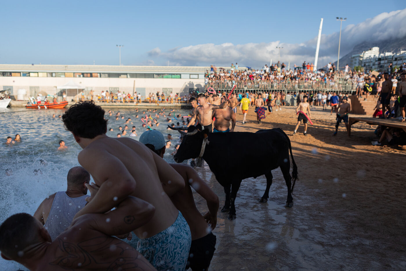 "Bous a la Mar" is a traditional bullfighting event held every summer in Dénia, in the province of Alicante, Spain, as part of the Santíssima Sang patronal festivities. On July 11, 2025, as every year, a temporary arena has been set up by the harbor to host the event. The idea is to run bulls into the arena, where participants attempt to carry them to the sea, sometimes by jumping into the water themselves. Many spectators watch from the stands or from boats moored nearby. Although the event has strong local roots and is recognized as a National Tourist Event, it also sparks debate about animal welfare.