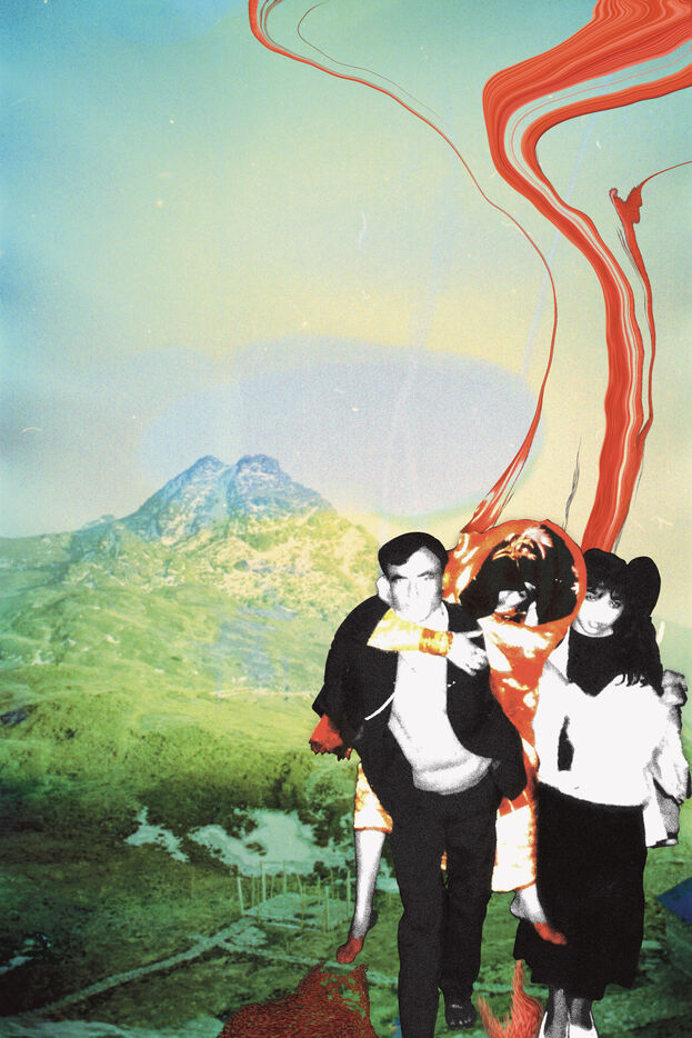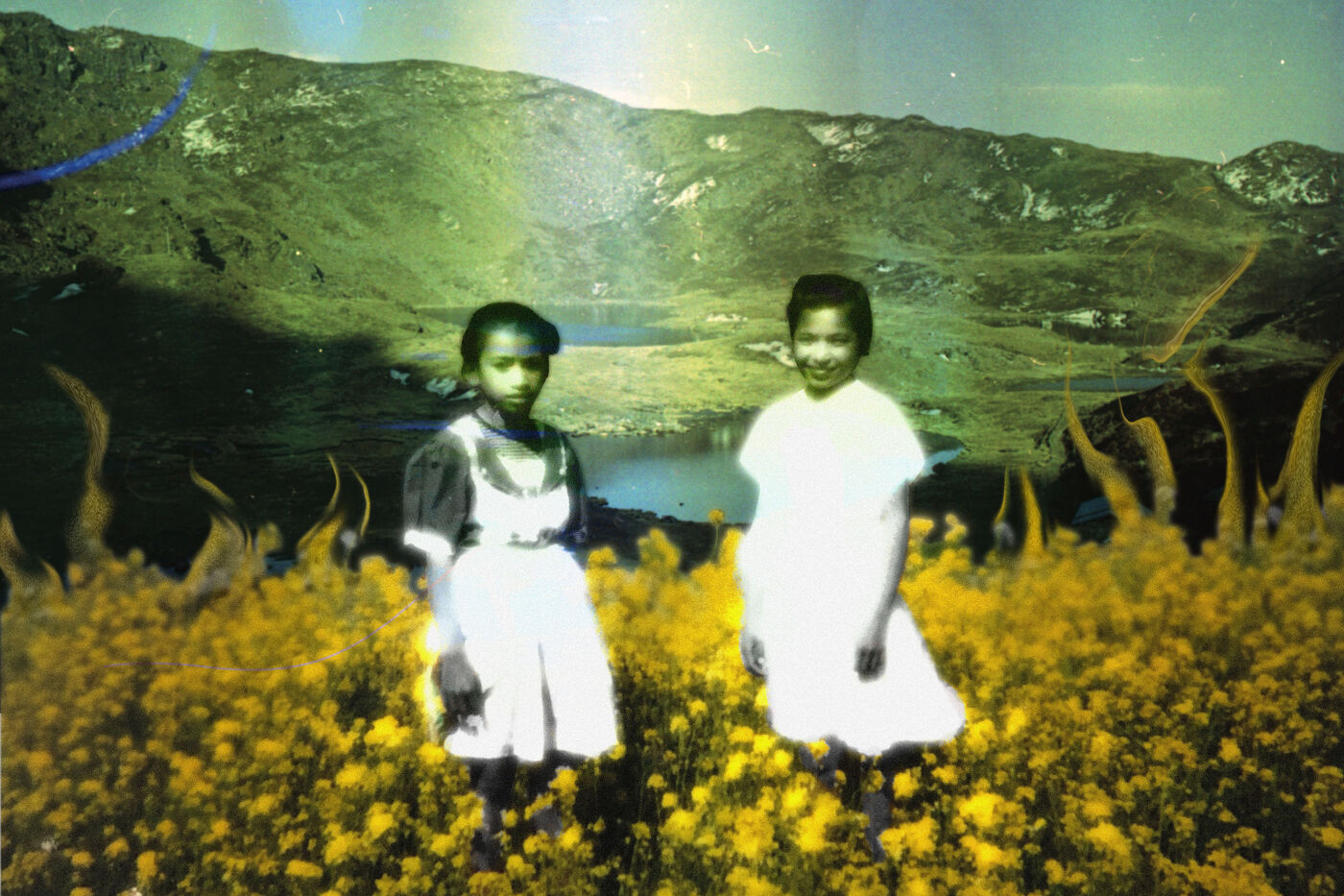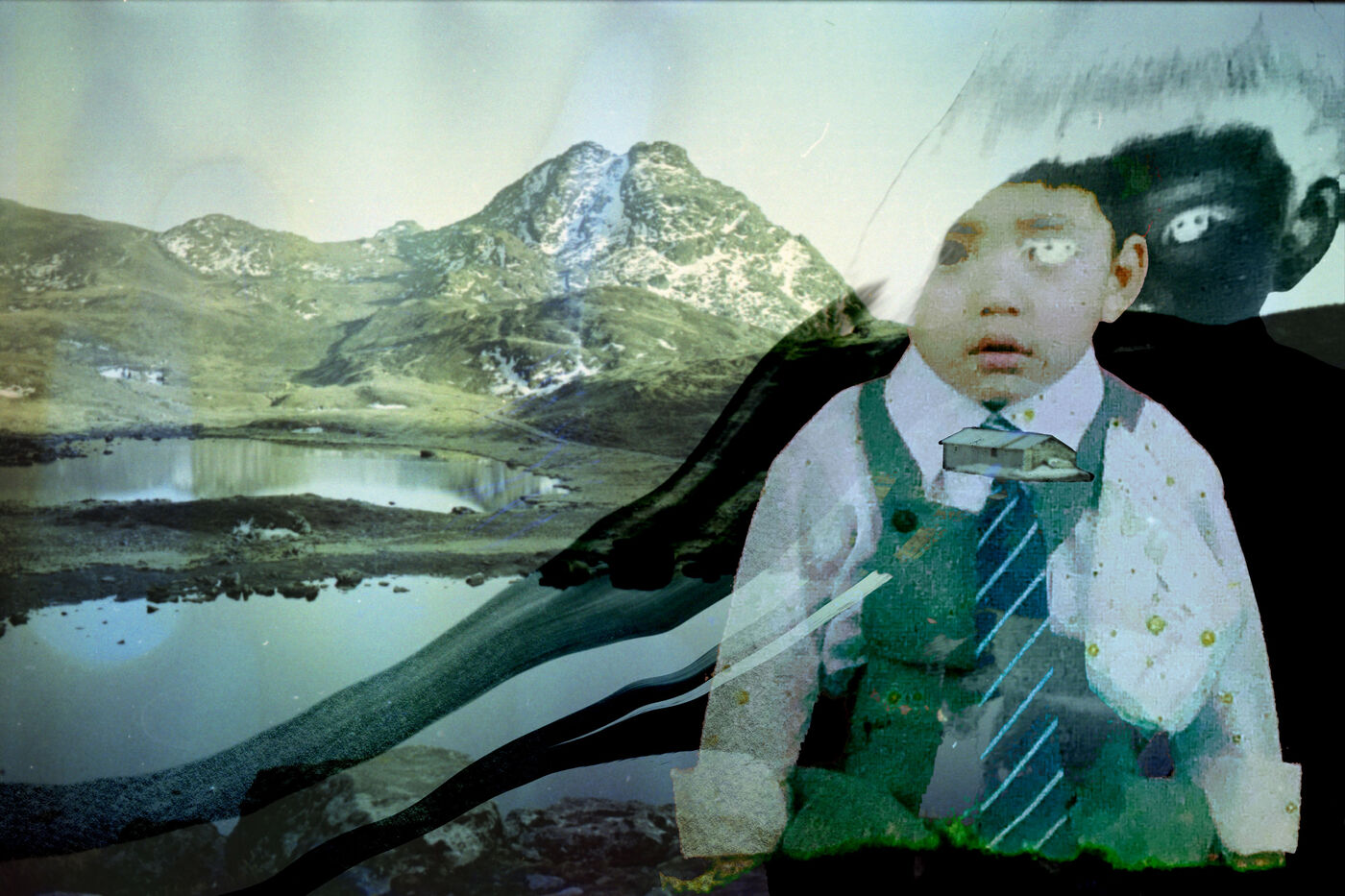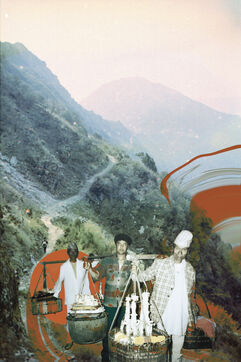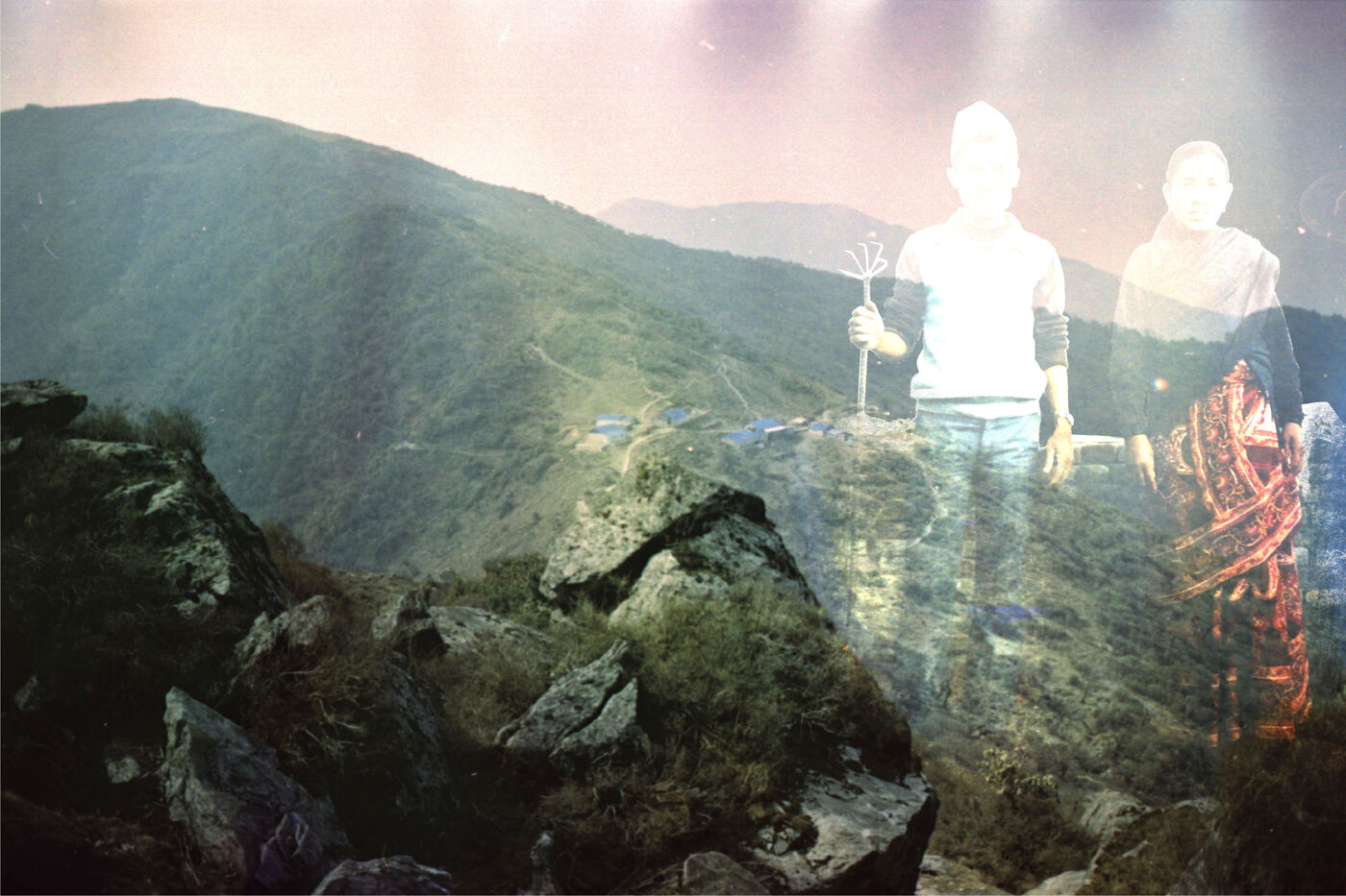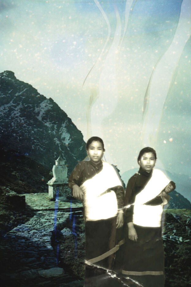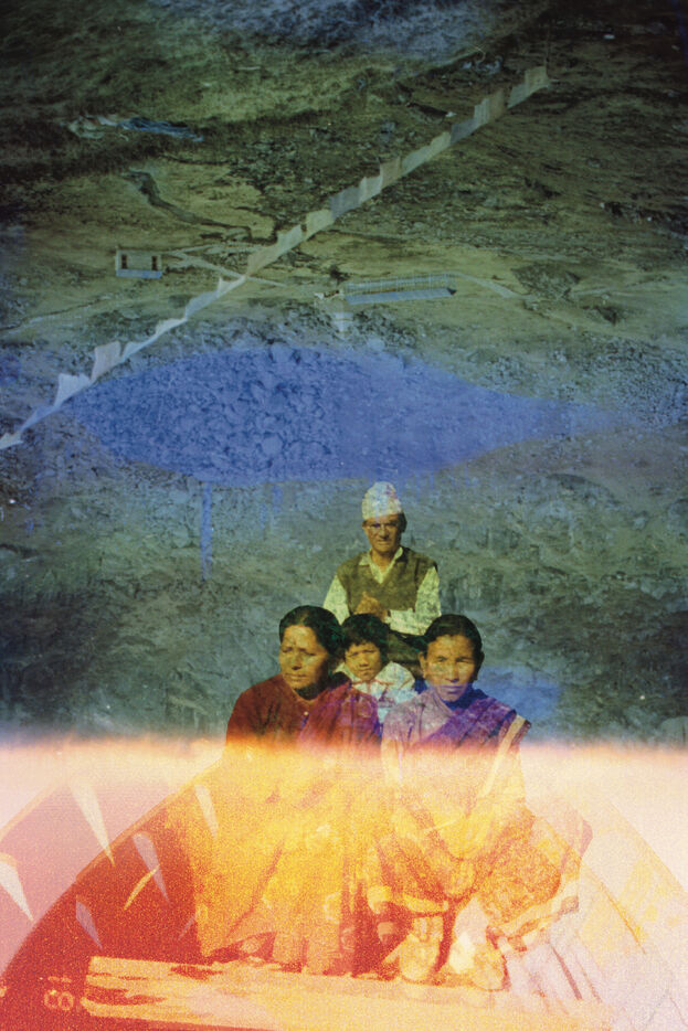 The landscapes were recorded on souped-up film during excursions through the sacred high mountains of Nepal, over 4000m high, in 2021 and 2023, by Mila Nijinsky. This base was offered to Lijen Maharjan (Nepalese artist) so that he could freely place his latest research around his family's silver archives. The photographs chosen by Lijen are between 25 and 50 years old. Colors, memories and transparencies blend, overlap and embrace to create new dreamlike landscapes, reminiscent of another time when memories remain evanescent and magical.