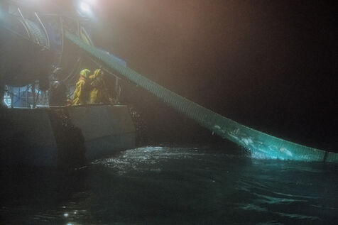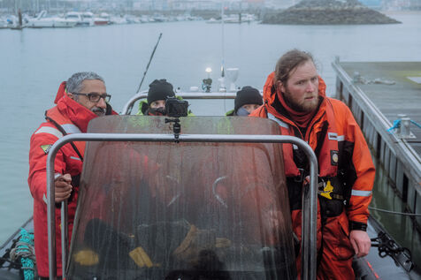 Finally, the trawlers come closer and gather the trawl net on a single boat. The team is busy monitoring the trawl's upwelling, including checking the presence of pingers, acoustic repellents to keep dolphins away, at the entrance to the net and the possible presence of asphyxiated dolphins, when the crew of the second trawler, which has bypassed Clementine, starts to insult them and throw eggs at them.