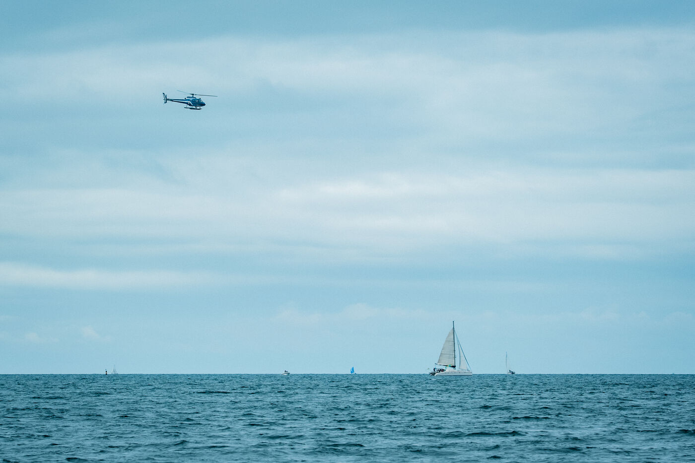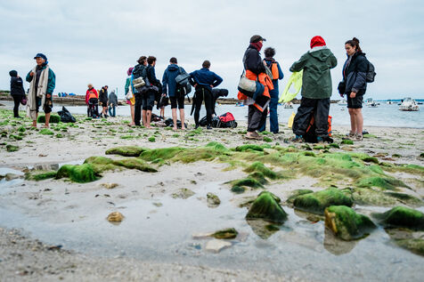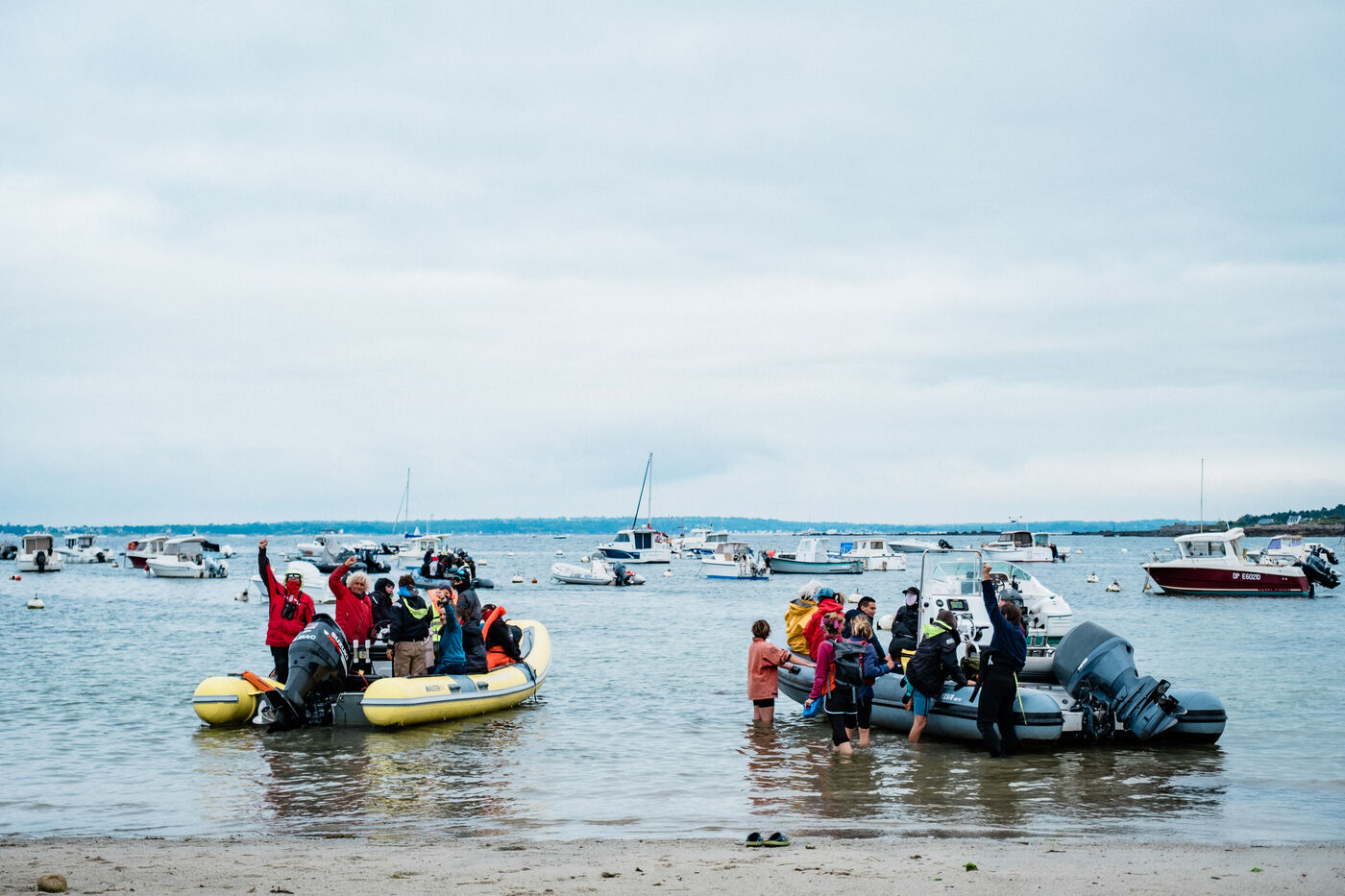 Une cinquantaine de bateaux, sur les 150 inscrits initialement, se sont rassemblés devant la plage de Cap Coz, après que la manifestation sur l'île du Loch aux Glénan, appartenant à Bolloré, ait été interdite par la préfecture maritime.