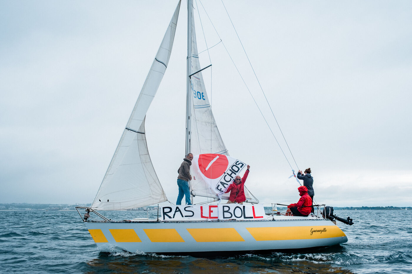 Manifestation en mer des Soulèvements de la Terre et du collectif local Lever les voiles contre l'homme d'affaires Vincent Bolloré, très implanté dans le Finistère sud et lié à l'extrême-droite, et son empire médiatique et industriel, notamment accusé de faire des ravages écologiques en Afrique.