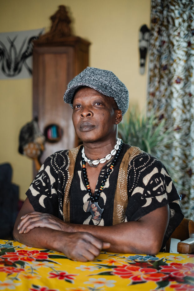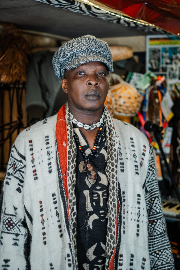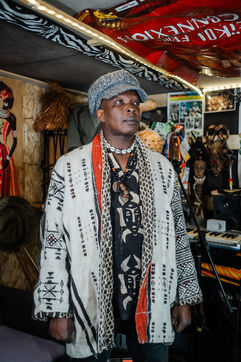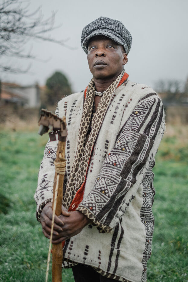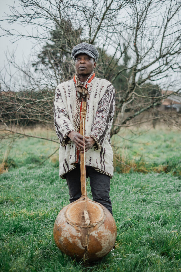 Portrait en habits de scène de Lassina Coulibaly, artiste, musicien, percussionniste, danseur et ancien employé du village ivoirien, dit village Bamboula, du parc animalier Planète Sauvage à Port-Saint-Pere. Originaire du nord de la Côte d'Ivoire, Lassina Coulibaly a fondé et dirigé Yelemba d'Abidjan, troupe de danses et percussions traditionnelles d'Afrique de l'Ouest, et il est membre du groupe d'afro-blues Tchologo.