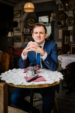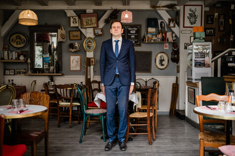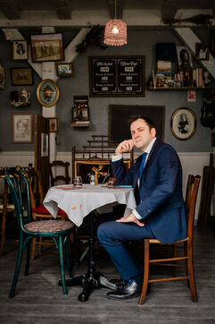 Portrait, le 25 avril 2025 dans le restaurant Mémé dans les orties à Angers, de Raphaël Jimenez, cheminot et comédien endossant régulièrement le rôle de Micron, sosie d'Emmanuel Macron, dans l'émission parodique Groland sur Canal plus.