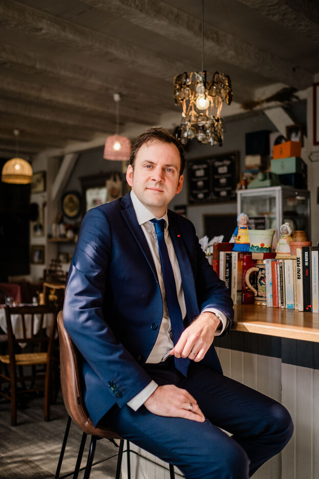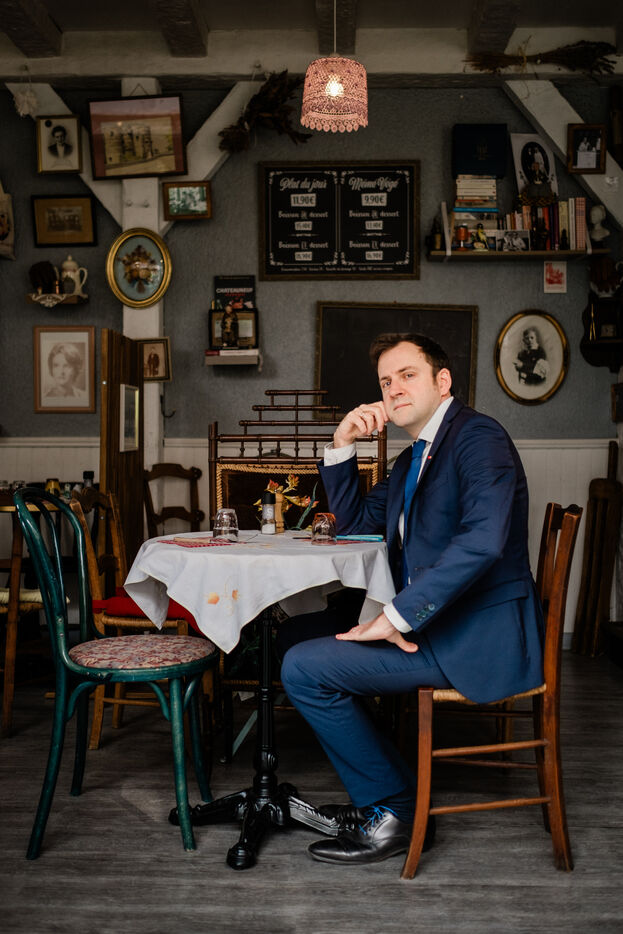Portrait, on April 25, 2025, at the restaurant Mémé dans les orties in Angers, of Raphaël Jimenez, railway worker and actor who regularly plays the role of Micron, Emmanuel Macron's doppelganger, in the parody show Groland on Canal Plus.