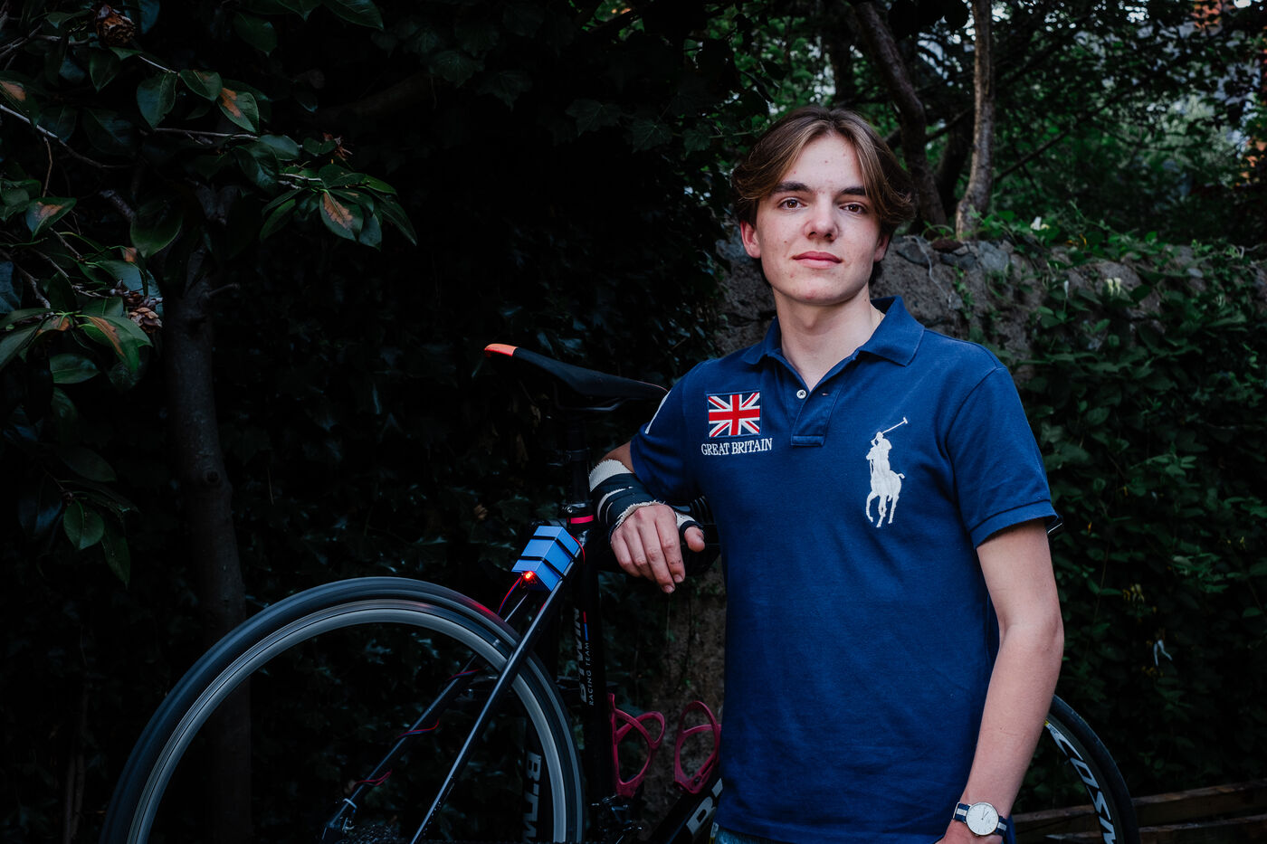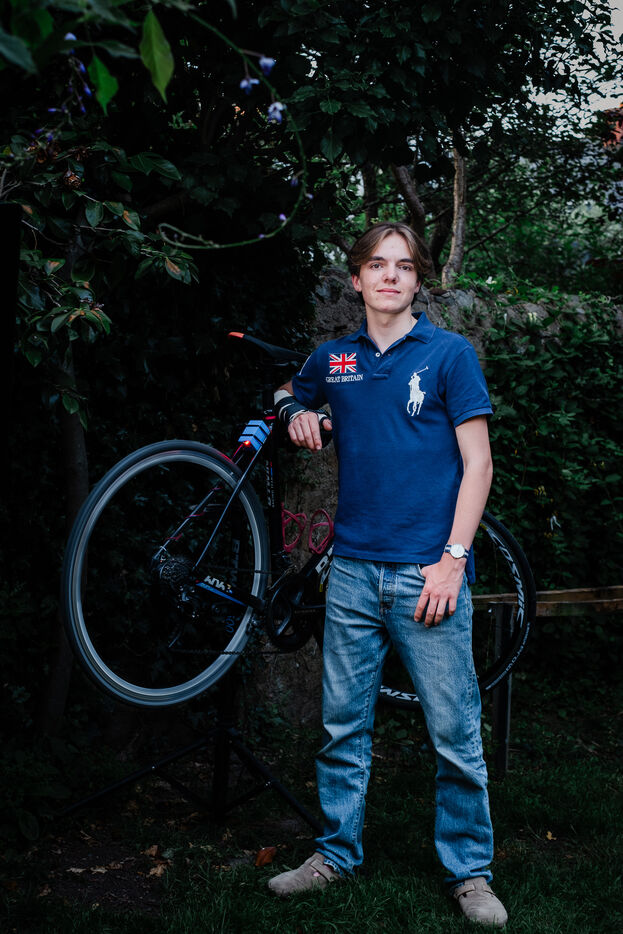 Portrait in his garden of Déodat Guerton, 16, winner of Science & Vie Junior's monthly Innovate competition with his Autofos, an automatic bicycle light that only turns on when its sensors detect wheel movement and low ambient light.