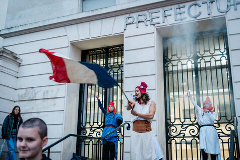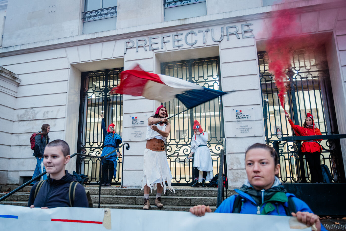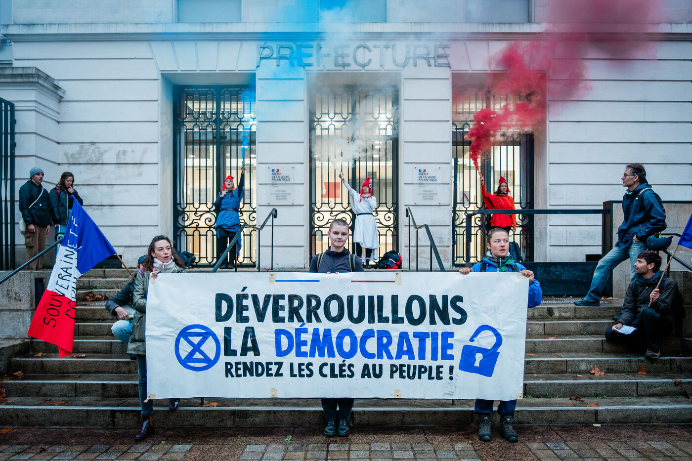 Extinction Rebellion Nantes protest in front of the Loire-Atlantique prefecture on November 10, 2025. Three activists chained themselves to the prefecture gates with U-locks, supported by around 20 other activists, to demand the unlocking of democracy, before being removed by law enforcement. Through this action, the activists denounced the gap between the will of the people and the inaction of politicians on social and environmental issues, such as the Zucman tax and the A69 motorway.