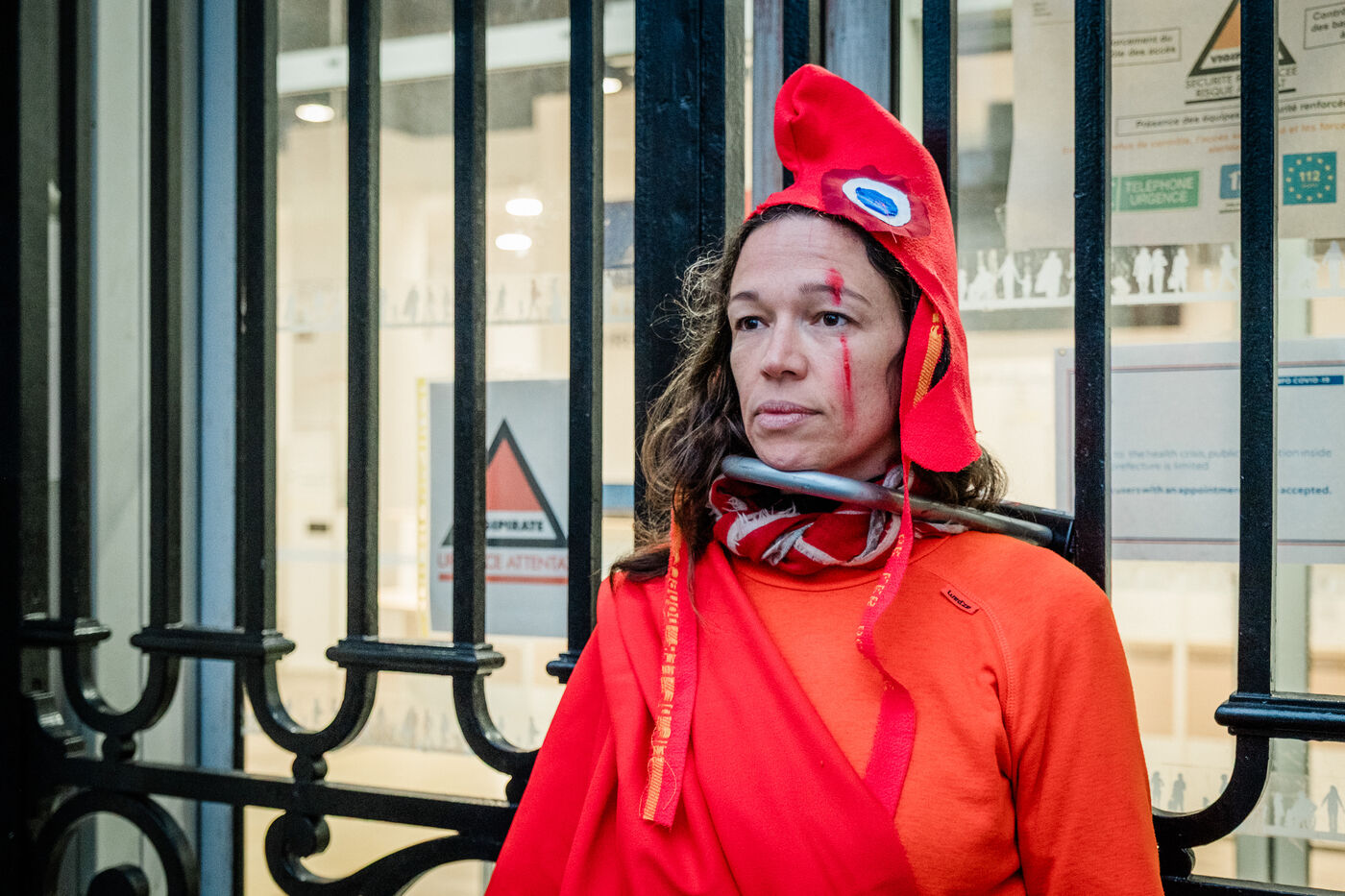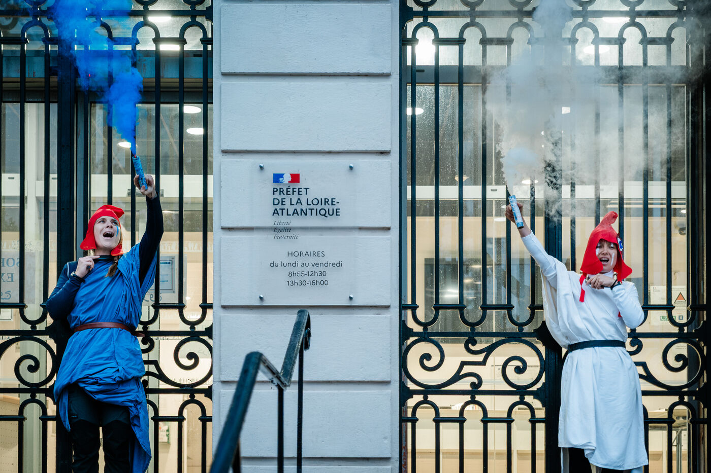 Action d'Extinction Rebellion Nantes devant la préfecture de Loire-Atlantique le 10 novembre 2025. Trois militantes se sont accrochées par le cou aux grilles de la préfecture à l'aide d'antivols en U, soutenues par une vingtaine d'autres activistes, pour demander à déverrouiller la démocratie, avant d'être délogées par les forces de l'ordre. Les activistes dénoncent par cette action le décalage entre la volonté du peuple et l'inaction des responsables politiques concernant les sujets sociaux et environnementaux, à l'instar de la taxe Zucman ou de l'A69.