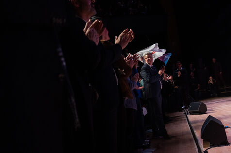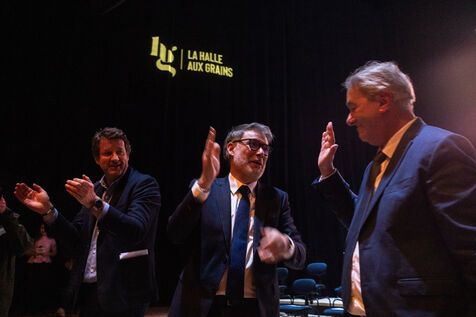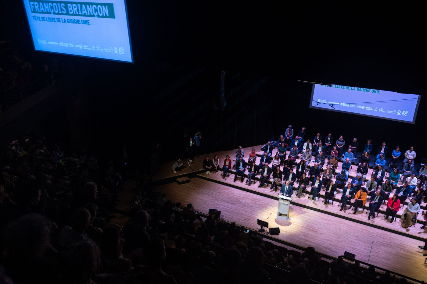 PS-Ecologist candidate François Briançon raises his arms in victory during his final campaign rally before the first round of municipal elections in Toulouse on 11 March 2026.