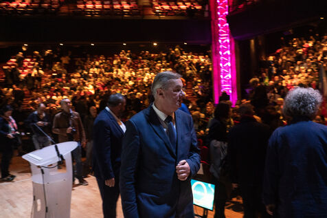 Le candidat PS-Ecologiste Francois Briancon brandit les bras pour la victoire lors de son dernier meeting de campagne avant le premier tour des elections municipales, a Toulouse le 11 mars 2026
