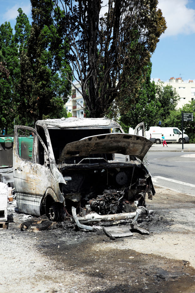Bâtiments et voitures incendiés, le lendemain des violences urbaines à Nantes après la mort d'un jeune homme atteint par un tir de policier lors d'un contrôle dans le quartier du Breil. Nantes, le 4 juillet 2018.