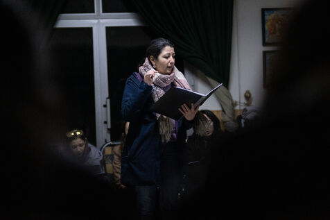 Dans le sous-sol d'un immeuble à Damas, vingt femmes sont assises en cercle sous une lampe fluorescente. Le reste de la pièce est plongé dans l'obscurité, car il n'y a pas d'électricité, et tout le monde garde son manteau. « Nous ne voulons pas du régime d'Assad, nous voulons la liberté », chante la chorale Gardenia, d'une voix parfaitement juste.