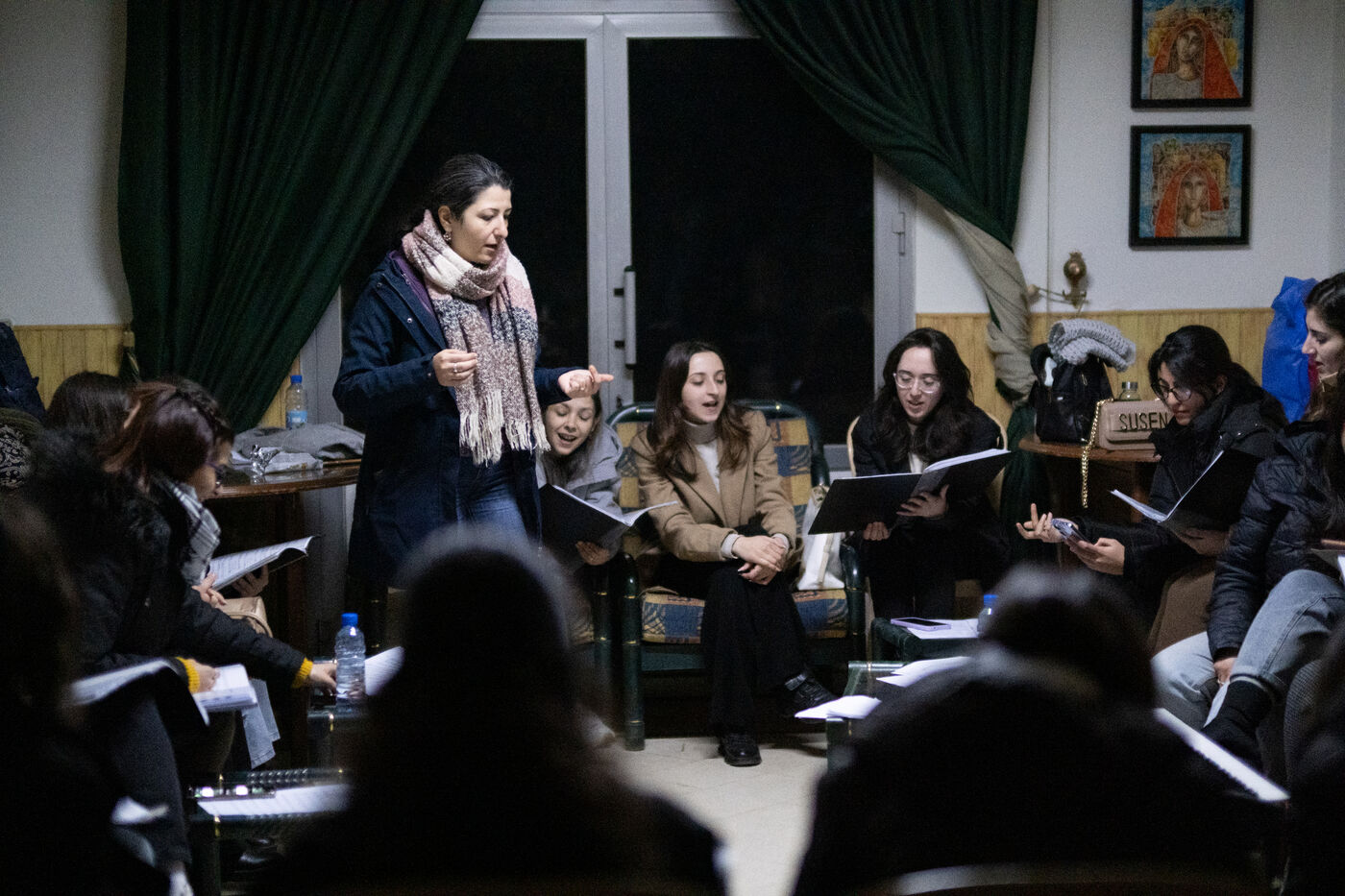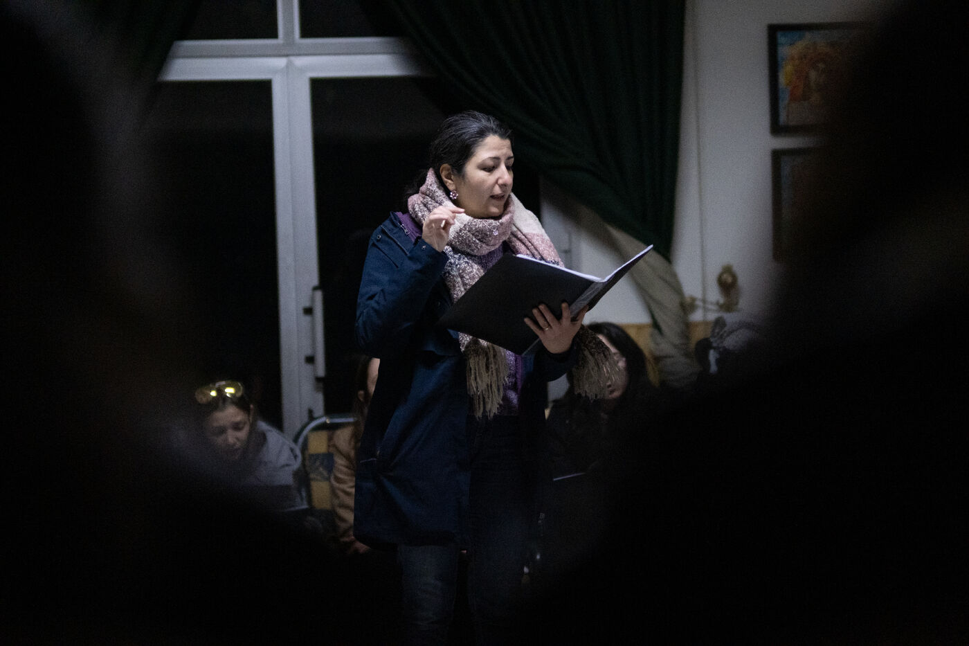 In the basement of an apartment building in Damascus, twenty women sit in a circle under a fluorescent lamp. The rest of the room is dark, as there’s no electricity, so everyone keeps their coats on. “We don’t want the Assad regime; we want freedom,” the Gardenia choir sings, their voices in perfect pitch.