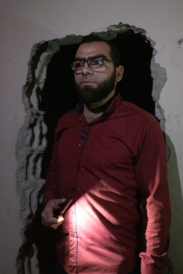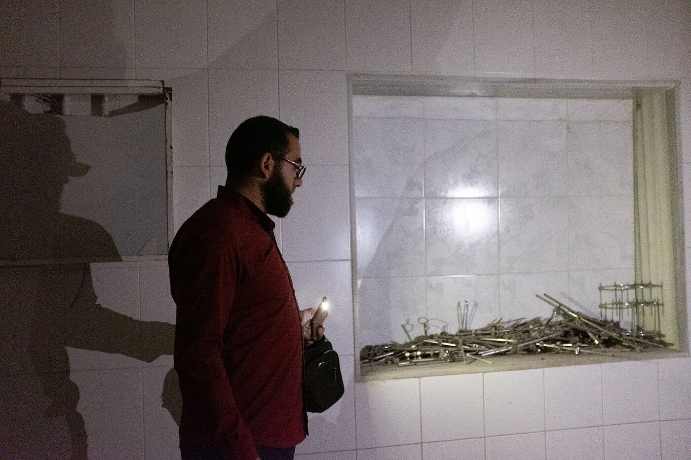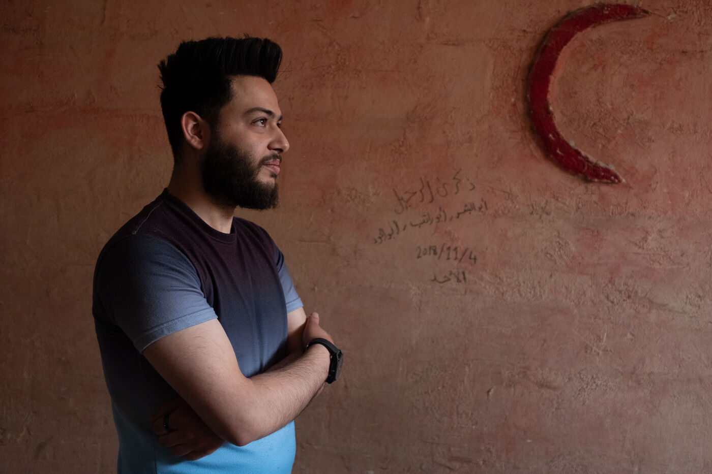 Ahmed al-Namer points to the words written on the hospital wall: “The Farewell, April 2018.” The 27-year-old nurse thought he would never see them again.