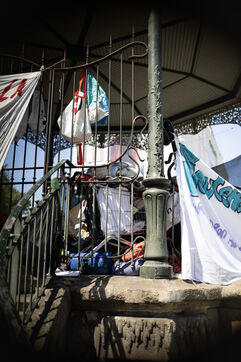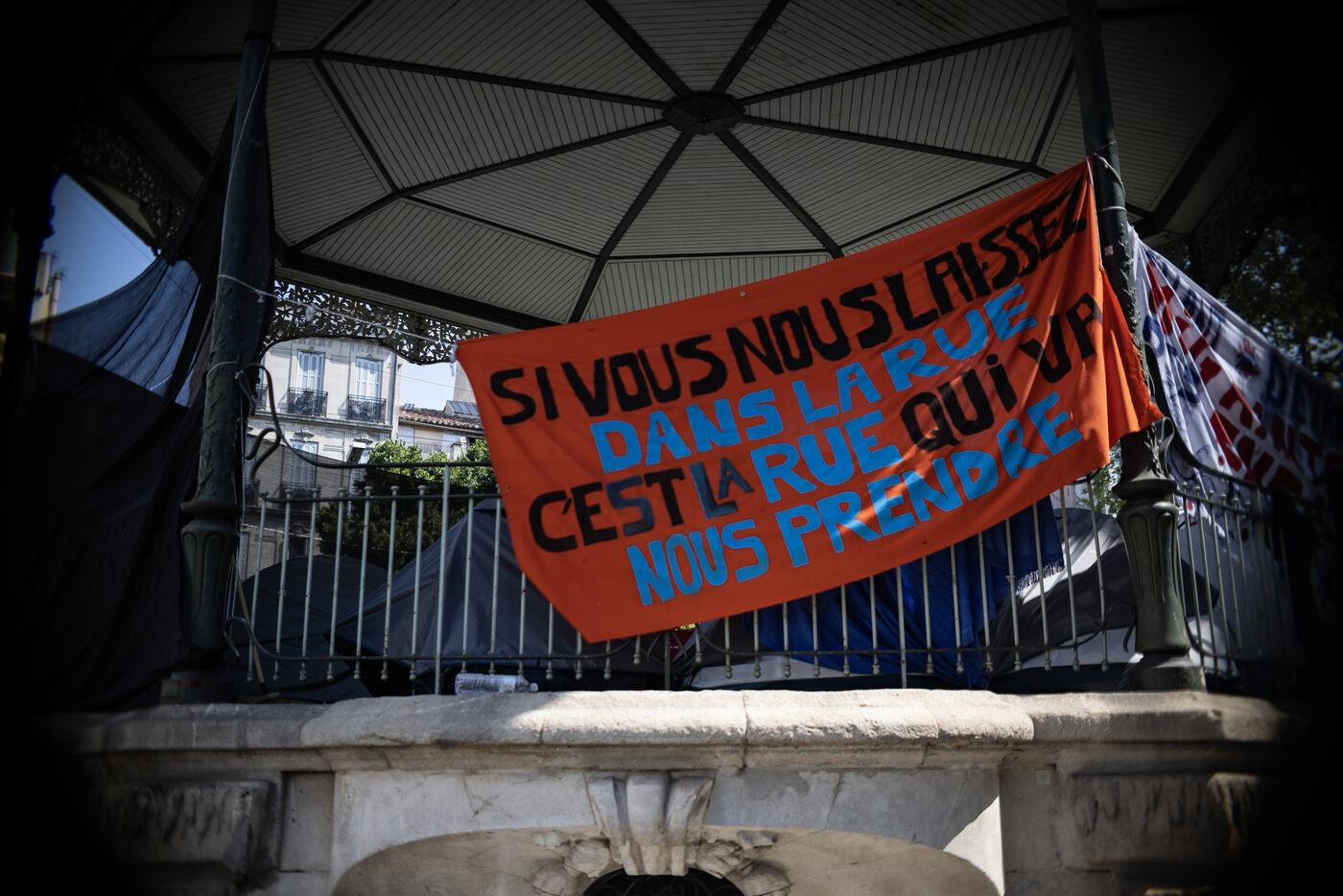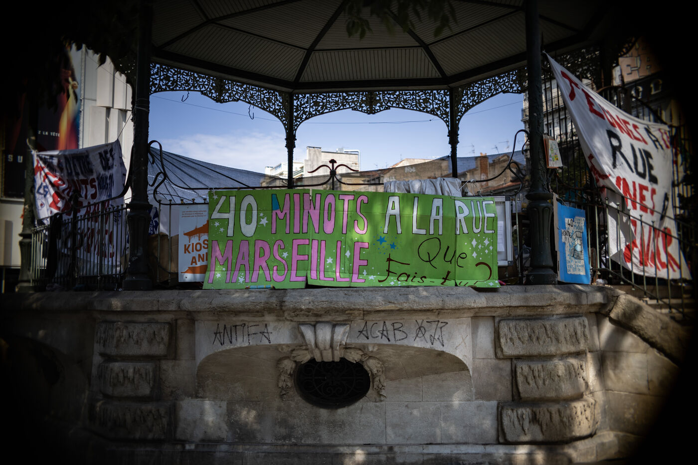 Le kiosque du square Leon Blum aux Réformés occupé par des jeunes exilés après que l'ADDAP 13 ait refusé de reconnaitre leur minorité.