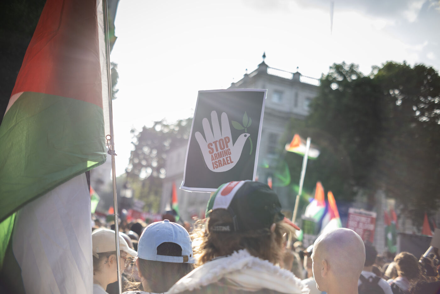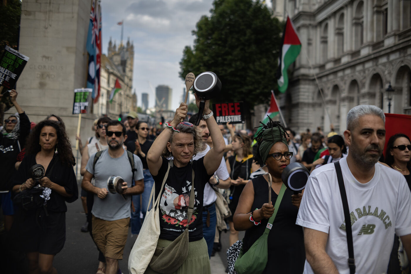 Pro-Palestinian demonstration with saucepans and cooking utensils in front of Downing Street in support of the Palestinian people.