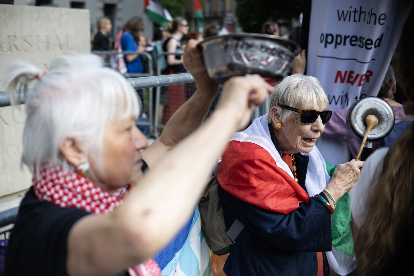 Manifestation pro-palestinienne avec casseroles et ustensiles de cuisine pour faire du bruit devant Downing Street en soutien au peuple Palestinien.