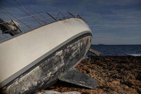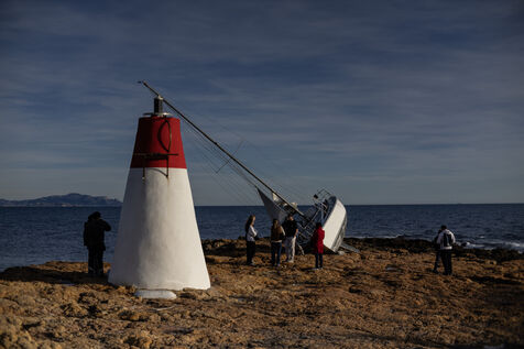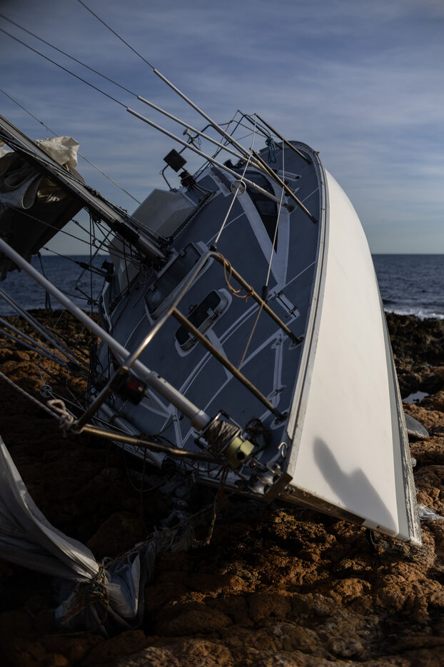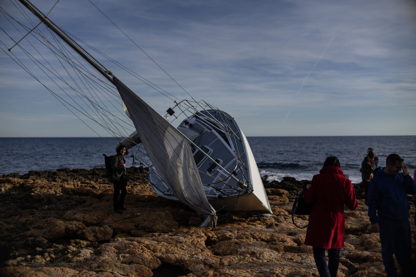 A sailboat washed up on the rocks of the coastline in Carry-le-Rouet after Storm Nils passed through.